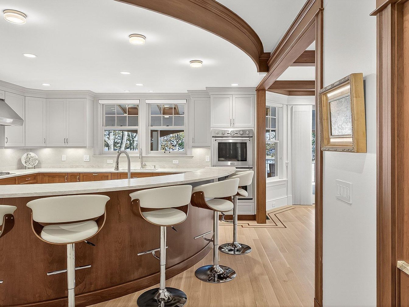 This modern kitchen features an inviting and spacious layout, centered around a stunning curved island with sleek white countertops and warm wooden accents. The light cabinetry complements the natural light pouring in through large windows, creating a bright and airy atmosphere. High-end appliances, including a built-in refrigerator and double ovens, seamlessly blend into the cabinetry for a clean look. Stylish bar stools with white upholstery add a contemporary touch, making the island perfect for casual dining or social gatherings. Warm hardwood floors enhance the cozy feel, while recessed lighting highlights the kitchen’s elegant design, ideal for family-friendly activities.