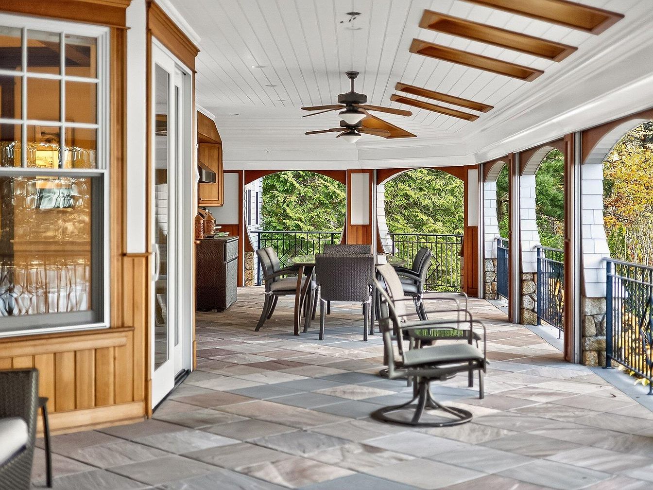 This inviting porch features a blend of traditional and modern design elements, perfect for family gatherings or peaceful retreats. Spacious and open, it showcases an elegant slate floor that transitions seamlessly to well-crafted wooden accents along the walls. Ample seating options include comfortable swivel chairs that provide flexibility. Natural light floods the space through expansive windows and decorative arches, enhancing the airy feel. A ceiling fan complements the architectural details, ensuring a breezy atmosphere. The adjacent outdoor area overlooks a lush landscape, ideal for enjoying warm evenings or entertaining guests in a stylish yet relaxed setting.
