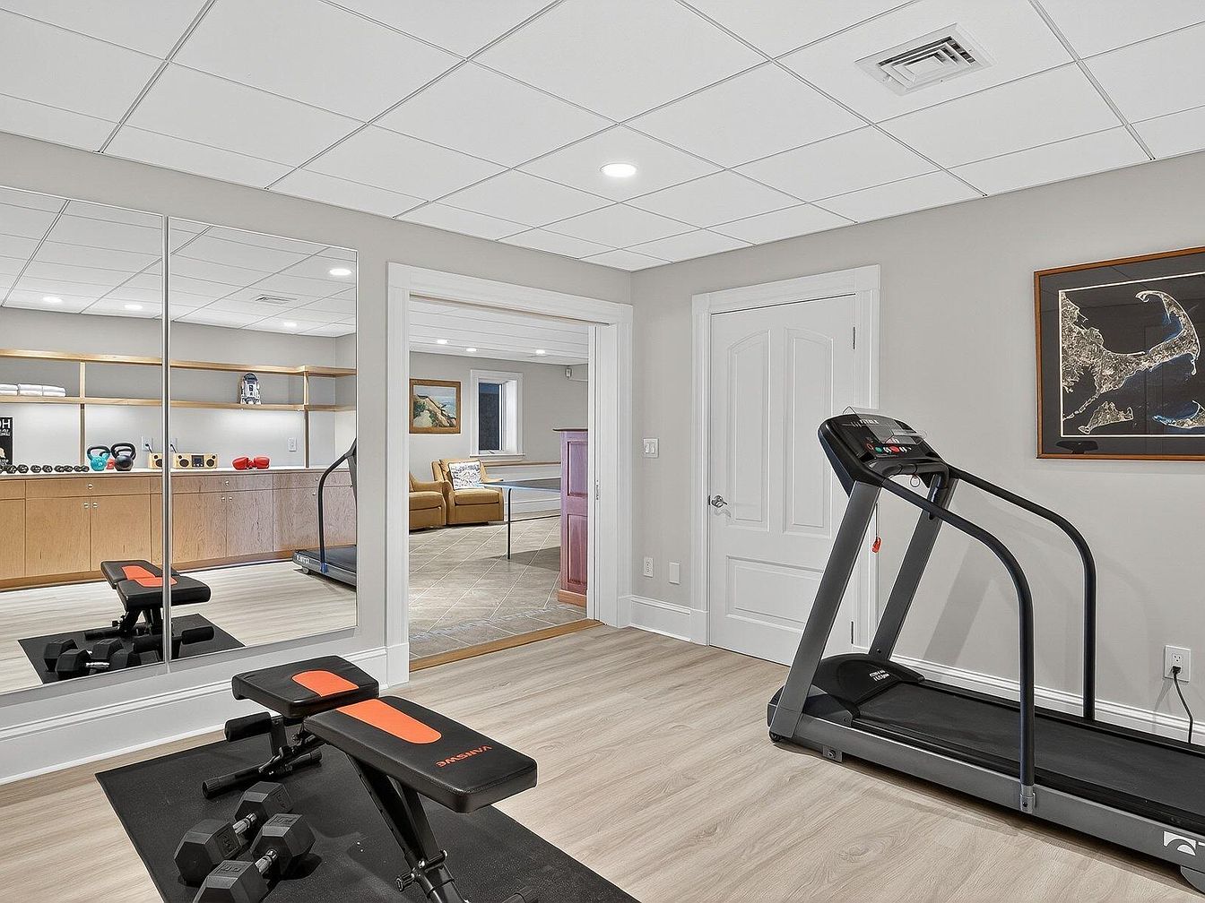 This spacious home gym features modern exercise equipment, including a treadmill and adjustable weight bench, ensuring a perfect space for fitness enthusiasts. The soft, light wood flooring complements the sleek design, while the gray walls create a calming environment. Ample natural light pours in from the nearby window, enhancing the airy atmosphere. Mirrored walls enable effective workout tracking while making the room appear larger. A minimalist shelving unit spans the back, providing organized storage for workout accessories. This multifunctional space is perfect for family activity, encouraging a healthy lifestyle in a stylish, comfortable setting.