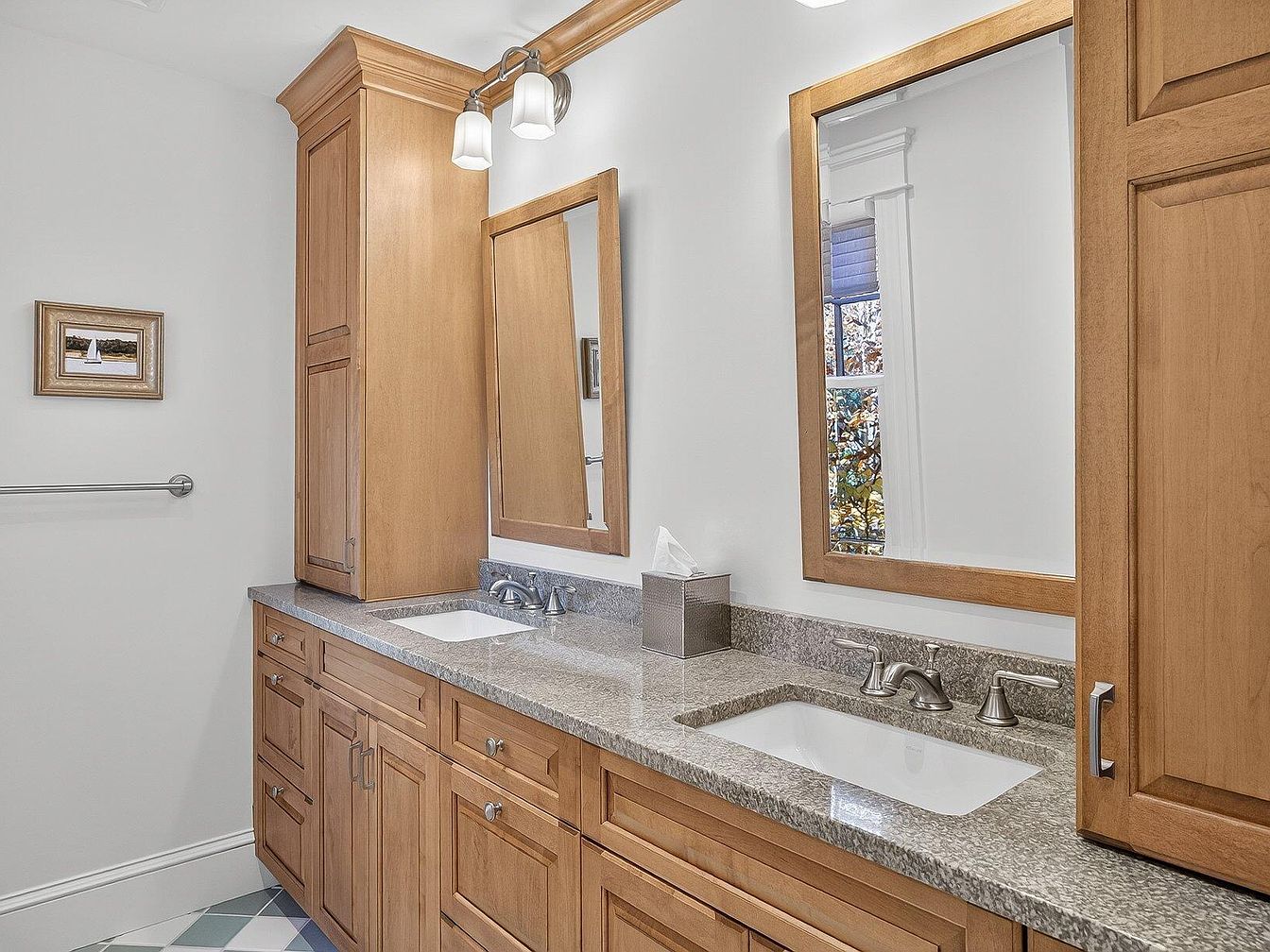 This dual sink bathroom features a harmonious blend of functionality and style. The light wood cabinetry complements the elegant granite countertop, creating a warm and inviting atmosphere. Ample storage is provided by the tall cabinet and spacious drawers, perfect for family needs. Brightened by natural light streaming through the window, the space feels open and airy. The polished chrome fixtures add a modern touch, while large mirrors enhance the sense of space. Subtle decorative accents, like the framed artwork, infuse personality into the room, making it a perfect retreat for both relaxation and daily routines.