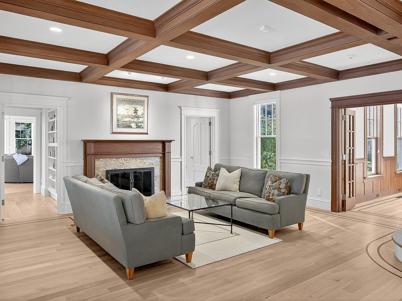 This inviting living room features a spacious and open layout, highlighted by rich coffered wooden ceilings that add depth and elegance. A focal point is the stylish fireplace framed in warm hues, accompanied by natural stone accents that enhance the cozy atmosphere. Soft neutral tones dominate the color scheme, complemented by a chic grey sofa adorned with decorative throw pillows. Large windows bathe the room in natural light, creating a bright and airy ambiance. The hardwood flooring provides a classic touch, while a minimalist glass coffee table offers a modern contrast, perfect for family gatherings or relaxed evenings.