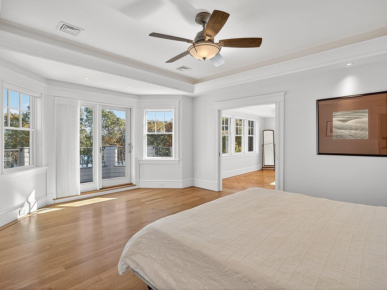 This spacious master bedroom features an airy layout with large windows allowing natural light to flood the room. The elegant design incorporates a soft color palette of whites and warm wood tones, enhancing the serene atmosphere. A stylish ceiling fan and crown molding add a touch of sophistication. The hardwood floor complements the plush bedding, while a cozy seating area by the balcony invites relaxation with stunning outdoor views. Family-friendly features include ample storage and a welcoming ambiance, making it an ideal retreat for rest and rejuvenation. A nearby mirror and tasteful wall art complete the inviting decor.