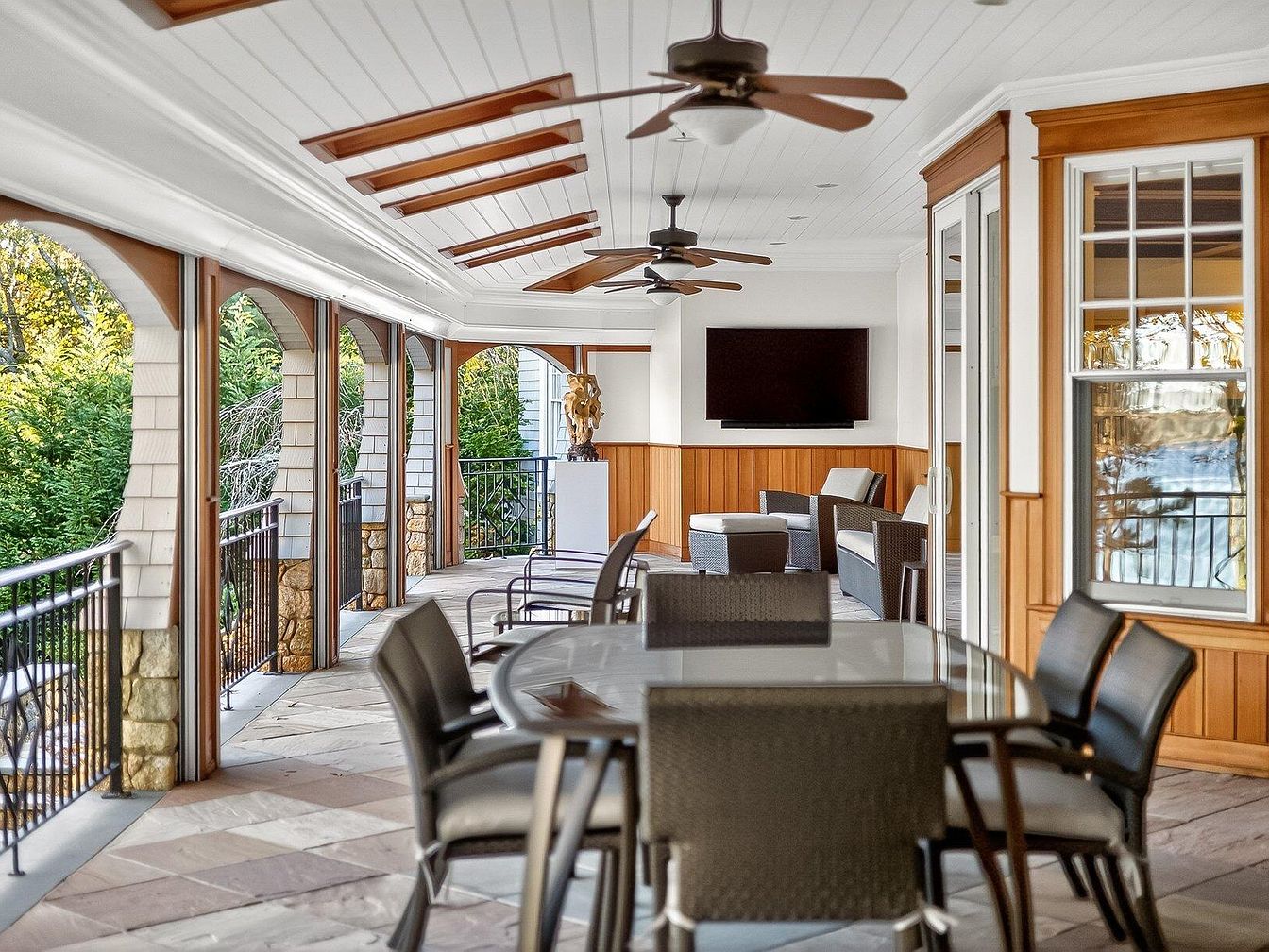 This spacious covered patio features an inviting layout with comfortable seating and an elegant dining area, perfect for family gatherings. The combination of natural wood paneling and soft white ceilings creates a warm ambiance, harmonizing with the stunning views outside framed by arching windows. Sleek outdoor furniture in muted tones complements the stone flooring, while decorative ceiling fans enhance ventilation. A mounted television offers entertainment options, ideal for casual lounging or summer parties. This outdoor oasis blends style and functionality, making it an ideal gathering spot for family and friends to relax and enjoy nature.