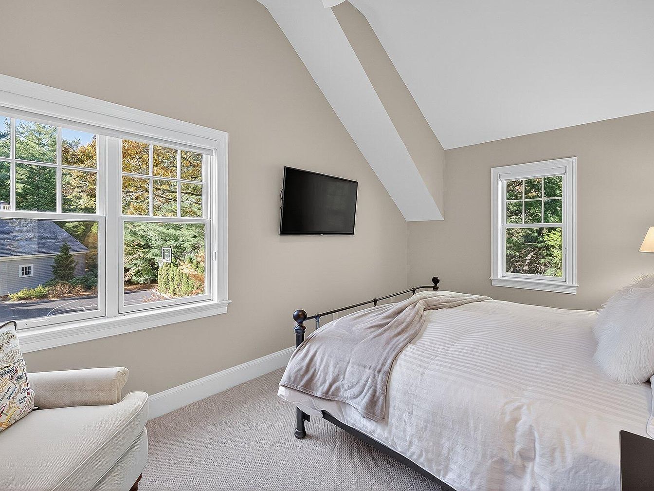 This serene master bedroom exudes comfort and relaxation with its stylish design. The vaulted ceiling enhances the spaciousness, complemented by soft beige walls that create a warm ambiance. Natural light floods the room through two large windows, offering scenic views of the lush outside greenery. A plush bed, adorned with crisp white linens and a cozy throw, invites tranquility. The room features a cozy reading nook by the window, perfect for unwinding, alongside a sleek wall-mounted TV for leisure. Functional yet elegant, this space balances modern aesthetics with inviting details, ideal for family living.