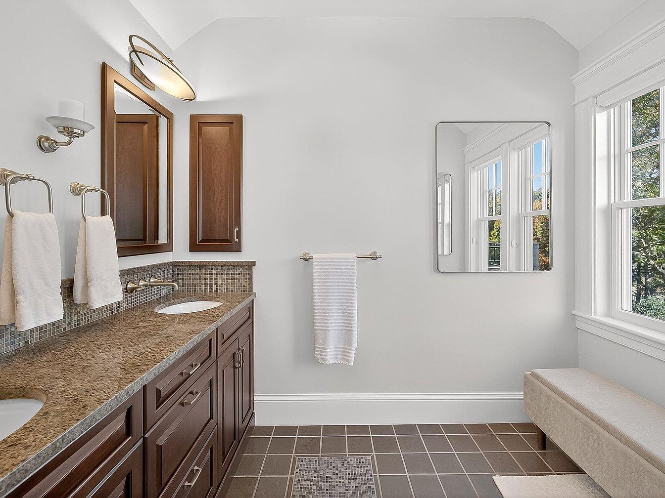 This elegant bathroom features a spacious layout with a dual vanity adorned with rich wooden cabinetry and a stunning granite countertop. The warm tones of the cabinetry contrast beautifully against the soft gray walls, creating a welcoming atmosphere. A chic rectangular mirror is framed with sleek lines, while wall-mounted fixtures offer modern convenience. Large windows invite natural light, enhancing the airy feel and providing picturesque views. Towels hang neatly from stylish towel bars, adding practical luxury. The charming bench offers a convenient resting spot, making this bathroom a perfect blend of sophistication and family-friendly features.
