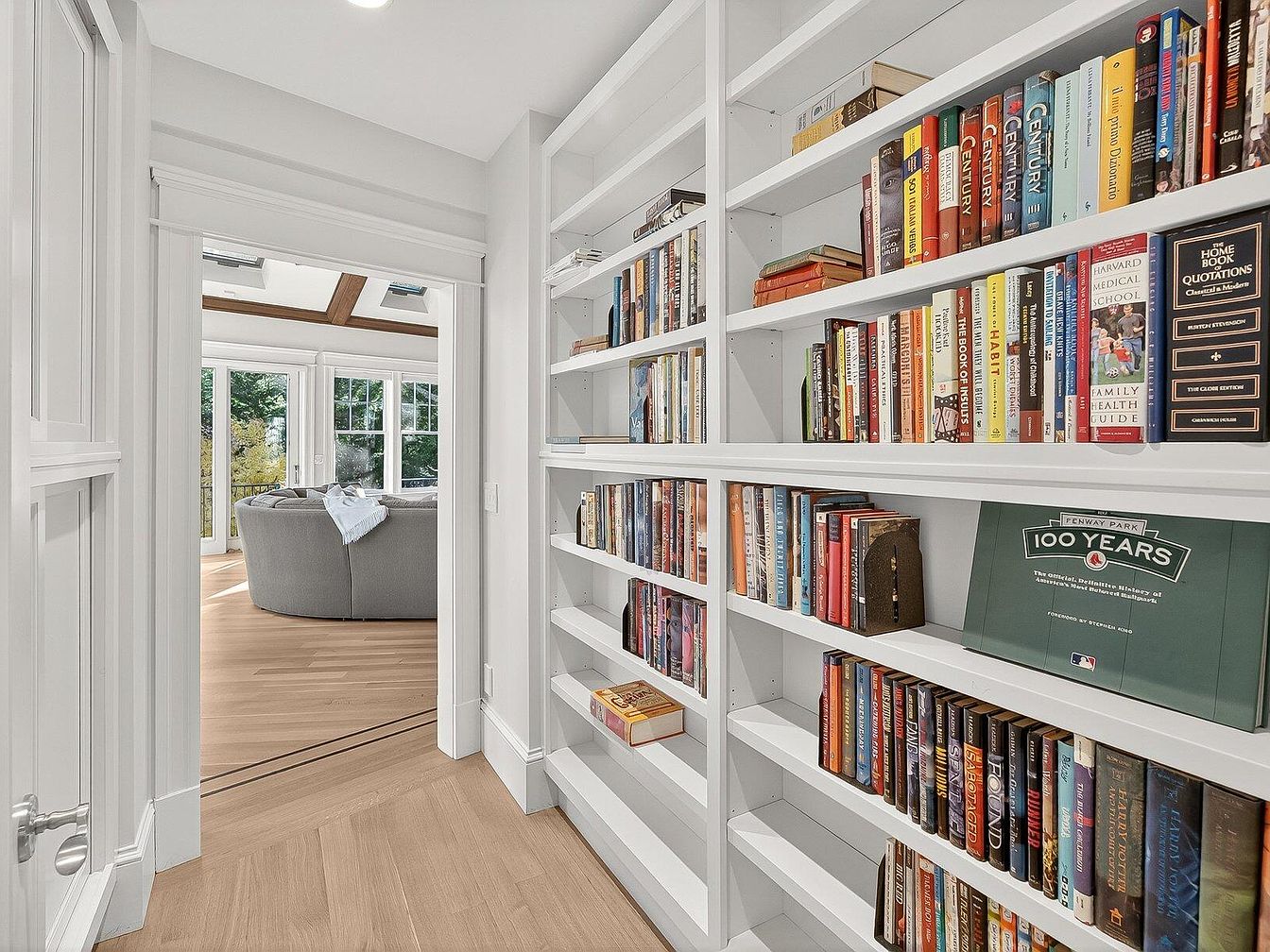 This inviting reading nook features a wall of built-in white bookshelves, filled with an array of colorful books that create a cheerful atmosphere. The warm, light wood flooring adds natural elegance, complementing the bright, airy feeling of the space. A doorway leads to a sunlit living area, adorned with large windows that beckon natural light. Soft textures and a plush gray sofa invite relaxation, making it an ideal gathering spot for family and friends. Architectural details, such as crown molding and stylish trim, enhance the sophisticated yet cozy aesthetic, creating a perfect blend of comfort and elegance.