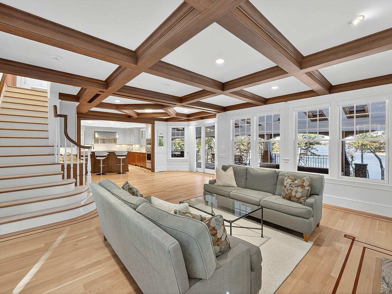 This stunning open living room harmonizes modern comfort with elegant design. The room features a stylish coffered ceiling that adds character, while large windows frame picturesque water views, flooding the space with natural light. A soft gray sofa anchors the room, accented by plush throw pillows that introduce warm hues. The seamless flow into the gourmet kitchen highlights family-friendly features, such as a spacious layout perfect for gatherings. Rich wooden flooring complements the white paneling and cabinetry, creating a fresh yet inviting atmosphere. The staircase, gracefully curved, leads to additional living areas, enhancing the home’s overall aesthetic.