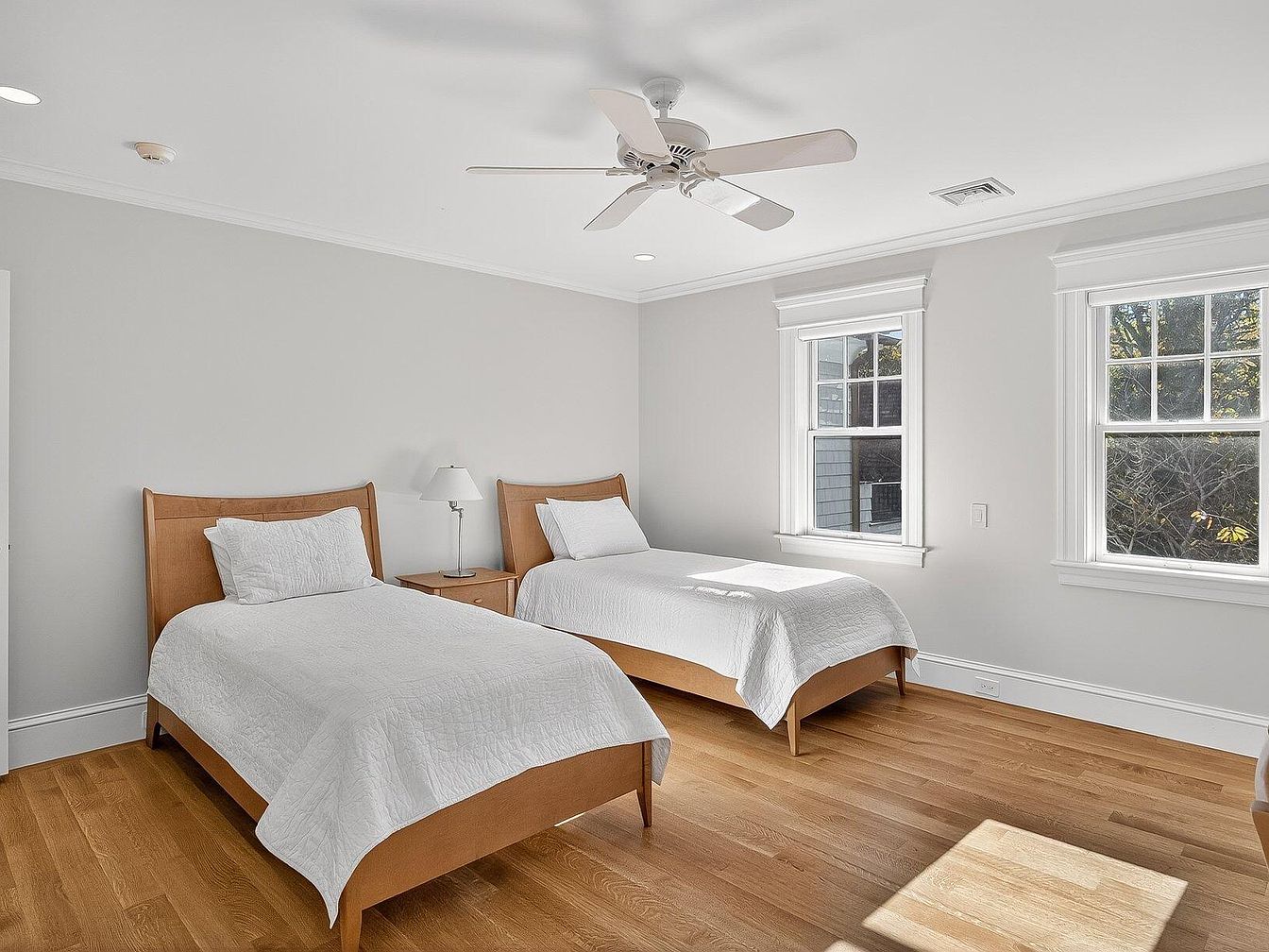 This tranquil guest bedroom features two elegant twin beds, each with a classic wooden frame that complements the warm, honey-toned hardwood floors. The light and airy ambiance is enhanced by soft white bedding and fresh, neutral walls, creating a serene retreat. Large double windows frame picturesque views, flooding the space with natural light while offering privacy. Functional nightstands host stylish lamps, providing both practicality and aesthetic charm. The ceiling fan adds a touch of comfort, ensuring a cozy atmosphere throughout the seasons. With its family-friendly layout and thoughtfully chosen decor, this room is perfect for welcoming guests.
