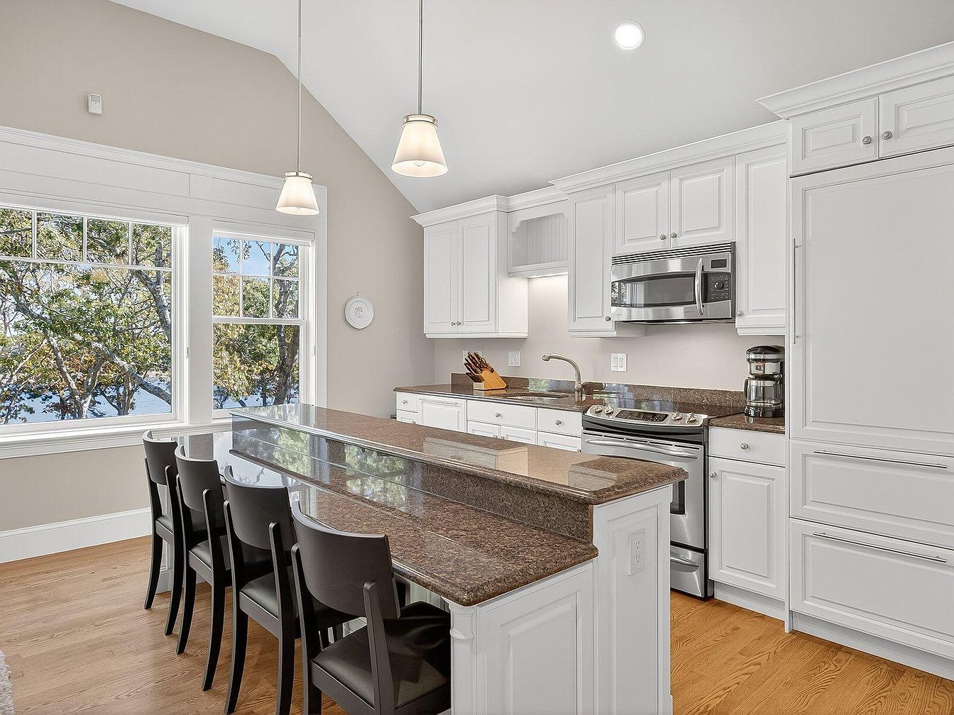 This modern kitchen features an open layout, accentuated by high, vaulted ceilings that enhance the airy feel. Crisp white cabinetry pairs elegantly with rich granite countertops, seamlessly blending functionality with style. A spacious island with seating for four offers a perfect space for family gatherings or casual meals. Large windows flood the room with natural light, providing beautiful views of the surrounding landscape. Sleek stainless-steel appliances complement the design, ensuring practicality for the home chef. The warm wooden flooring adds a comforting touch, making this kitchen not just a cooking space, but a welcoming heart of the home.