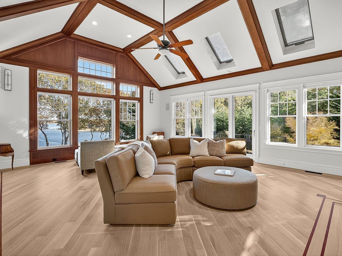 This inviting living room features a soaring vaulted ceiling adorned with elegant wooden beams that add warmth and sophistication. The expansive windows allow natural light to flood the space, offering stunning views of nature and enhancing the airy ambiance. A plush sectional couch in muted beige provides comfortable seating, accented with soft, textured pillows for a cozy touch. Complementing the modern design, the sleek round coffee table creates a focal point while ensuring easy movement. Natural hardwood flooring enhances the family-friendly atmosphere, making this a perfect gathering space for relaxation and entertainment.