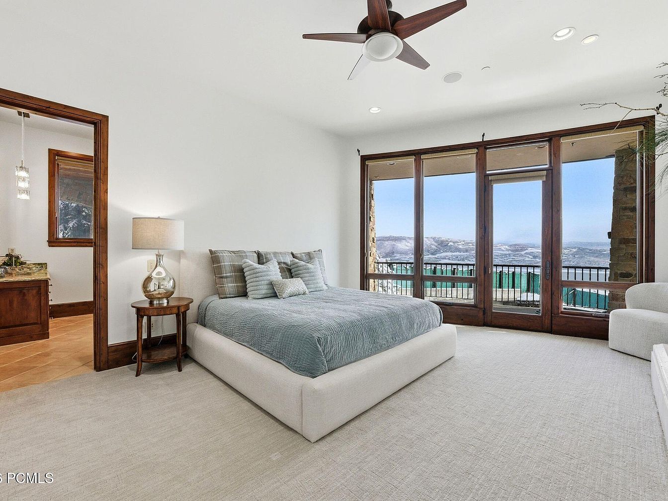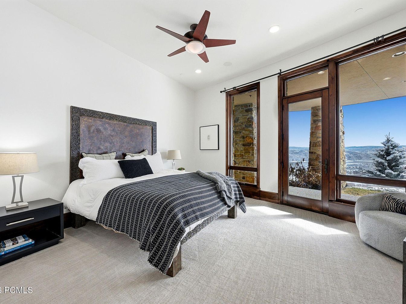 This master bedroom offers a serene escape with large, panoramic windows framing breathtaking views. The earthy color palette, featuring soft whites and rich wood tones, complements the stunning natural surroundings. A sophisticated king-sized bed with a decorative headboard anchors the space, while crisp linens and a patterned throw add texture. A contemporary ceiling fan provides comfort, and the plush carpet invites warmth. Nightstands with soft lamps create a cozy ambiance, while an accent chair offers a reading nook. Thoughtful architectural details, like the rustic stone accents visible outside, enhance the connection to nature, making this room a tranquil haven.