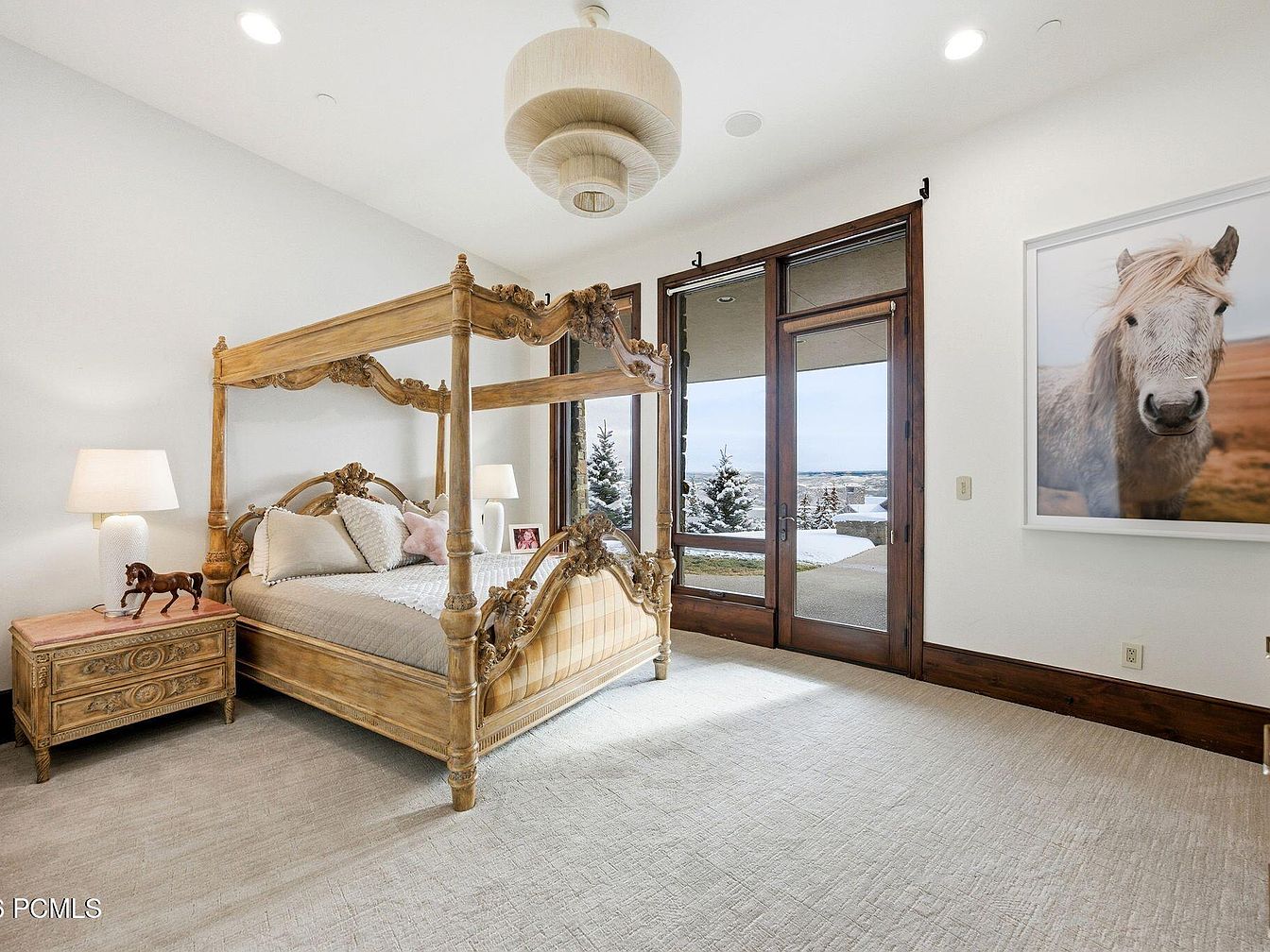 This exquisite master bedroom combines luxury and warmth with its ornate four-poster bed, adorned with intricate carvings and soft linens. A plush area rug anchors the space, enhancing the cozy atmosphere. The light color palette of whites and soft grays reflects natural light, while the brown wood accents create a sophisticated contrast. Thoughtfully placed lamps add a soft glow, complementing the artistic horse print on the wall, which serves as a unique focal point. Large glass doors open to scenic views, seamlessly connecting indoor comfort to the outdoors, making this space family-friendly and inviting.