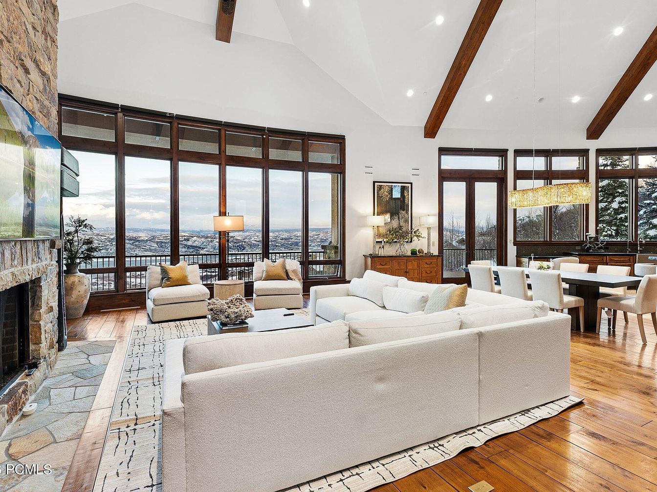 This inviting living room boasts an open layout, featuring expansive windows that frame breathtaking views of the surrounding landscape. The high, vaulted ceiling enhances the spaciousness, complemented by rich wooden beams that add warmth and character. A cozy, L-shaped sectional invites family gatherings, while elegant accent chairs provide additional seating. The neutral color palette infuses tranquility, with splashes of yellow in the cushions for a subtle pop. A modern, sleek coffee table anchors the space, resting on a beautifully patterned area rug. Natural elements, like the stone fireplace, seamlessly tie into the overall aesthetic, creating a perfect blend of comfort and style.