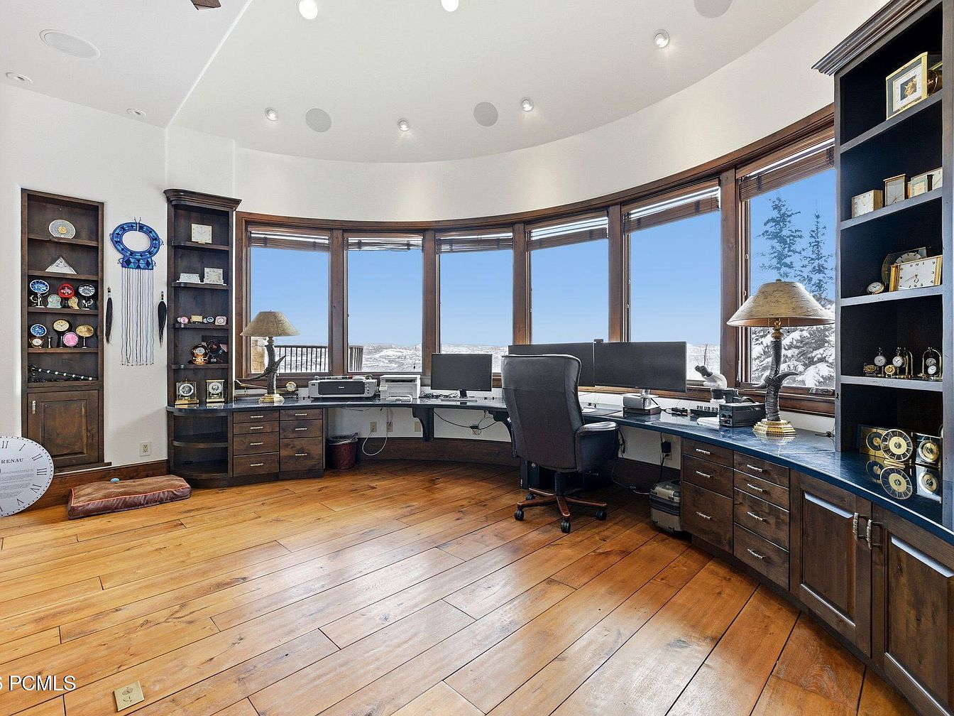 This elegant home office features a stunning curved design with panoramic windows that invite natural light and breathtaking views. Rich wooden floors complement the dark cabinetry, enhancing the warmth of the space. The desk area offers a streamlined layout, perfect for productivity, while ample built-in shelving showcases personal memorabilia and decorative accents, adding character. Comfortable seating ensures a family-friendly environment, promoting both work and relaxation. A tasteful lamp and contemporary office equipment blend functionality with style, creating an inspiring sanctuary for creativity and focus. Neutral color tones create a calming atmosphere, making it an ideal work-from-home retreat.
