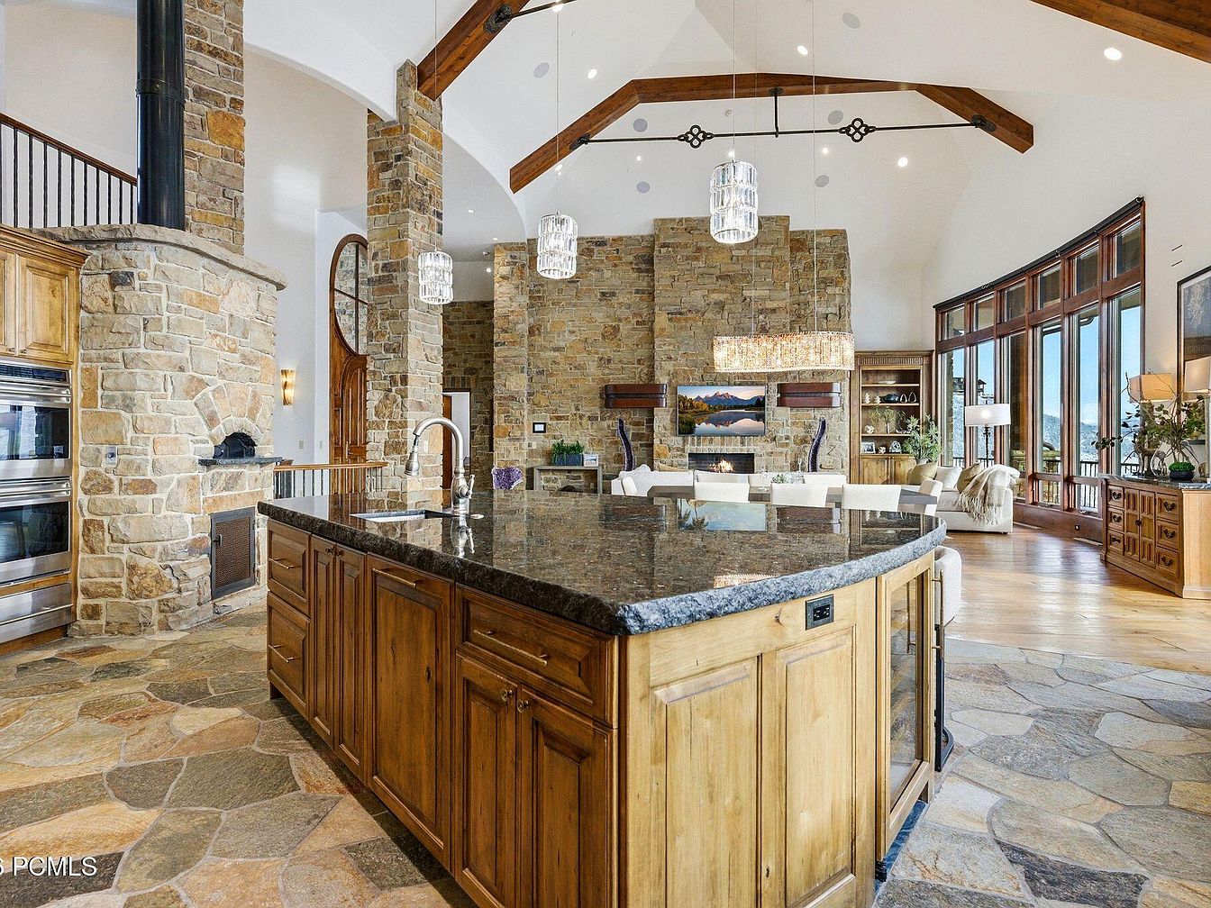 This inviting open concept kitchen features a large center island with rich wooden cabinetry and a dark granite countertop, seamlessly merging functionality and elegance. The vaulted ceiling with exposed wooden beams complements the rustic stone accent wall, creating a warm, inviting atmosphere. Natural light floods the space through expansive windows, offering stunning views and enhancing the home’s connection to nature. Family-friendly features include ample seating and a cozy fireplace, perfect for gatherings. The earthy color palette, highlighted by natural stone and rich wood tones, exudes comfort and sophistication, making this kitchen an ideal heart of the home.
