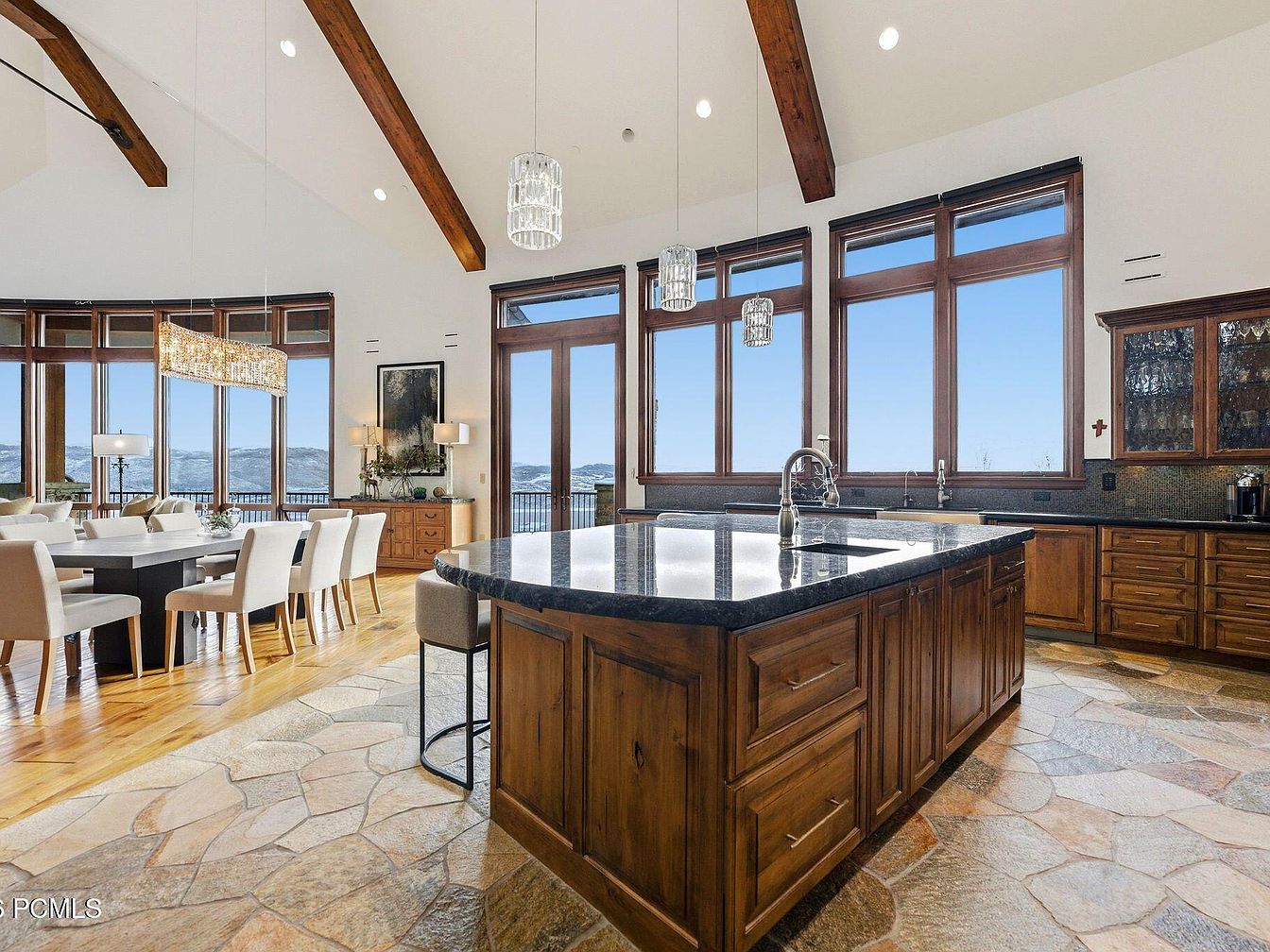 This spacious kitchen and dining area features a warm, inviting layout, characterized by high vaulted ceilings with exposed wooden beams that enhance the cozy atmosphere. The central island boasts a sleek black granite countertop, complementing the rich wooden cabinetry that offers ample storage. Stylish pendant lighting adds a modern touch, creating an elegant focal point above the dining table. Surrounding large windows flood the space with natural light and showcase breathtaking views. The area is designed for family gatherings, with contemporary dining chairs maximizing comfort. The combination of stone flooring and wooden accents exudes rustic charm, making it a serene retreat.