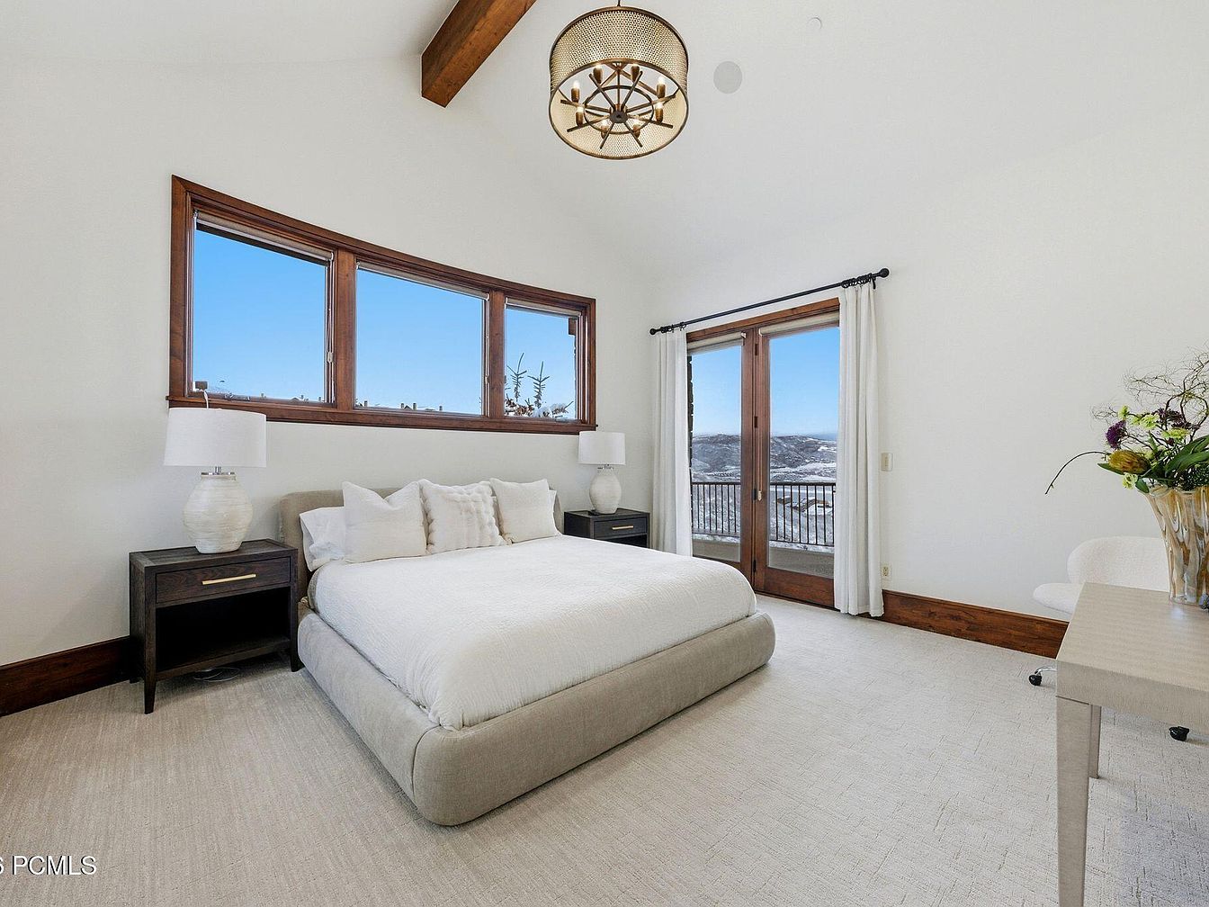 This serene master bedroom features a spacious layout with expansive windows that flood the room with natural light, showcasing breathtaking mountain views. The warm, wooden floors complement the rich, dark upholstery of the king-sized bed and the elegant gray bedding. A contemporary nightstand adds functionality, while the soft area rug underfoot enhances comfort. Decorative elements, like the stylish sconce lighting and cozy armchair, create a welcoming atmosphere. The neutral color palette exudes tranquility, making it a perfect retreat for relaxation. Architectural details, such as the high ceiling and framed windows, add a touch of modern sophistication.