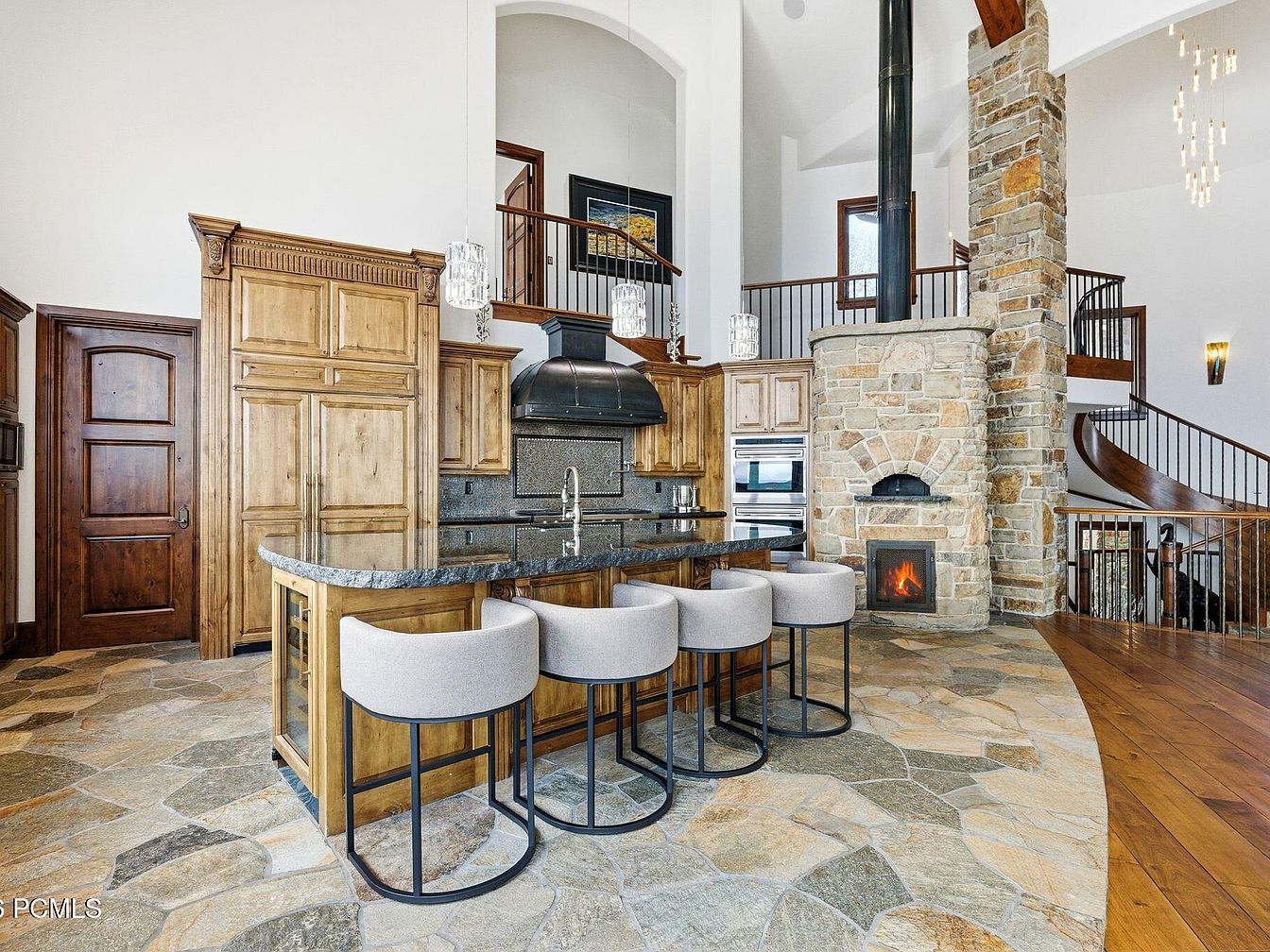 This stunning kitchen harmonizes functionality with elegance, featuring a spacious layout that invites family interaction. The rich wooden cabinetry adds warmth, complemented by a striking granite countertop that serves as both a preparation space and a gathering spot with stylish bar stools. A unique stone fireplace enhances the cozy atmosphere, while high ceilings and strategically placed windows flood the area with natural light. The modern appliances are seamlessly integrated, maintaining a clean aesthetic, while textured stone flooring offers durability and charm. Elegant lighting fixtures add a touch of sophistication, making this kitchen the heart of the home.