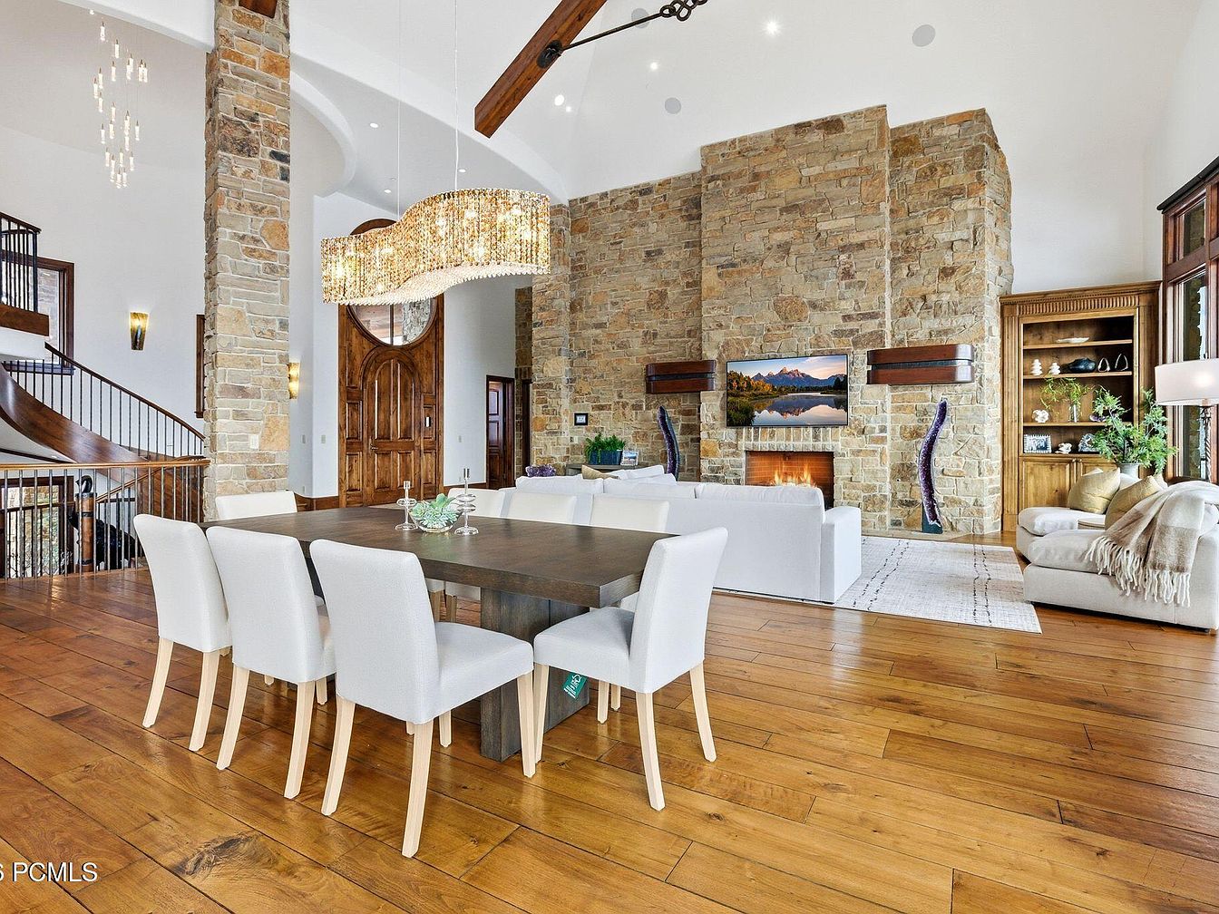 Embrace the harmonious blend of style and comfort in this spacious dining and living area, featuring a warm, rustic aesthetic. The centerpiece is a solid wood dining table surrounded by sleek, upholstered chairs, perfect for family gatherings. A stunning chandelier illuminates the space, complemented by natural light streaming through large windows. The stacked stone fireplace creates a cozy atmosphere, while the soft, neutral color palette enhances the inviting feel. Rich wooden floors anchor the room, and elegant touches, like built-in shelving and decorative plants, add a personal flair, making it a true heart of the home.