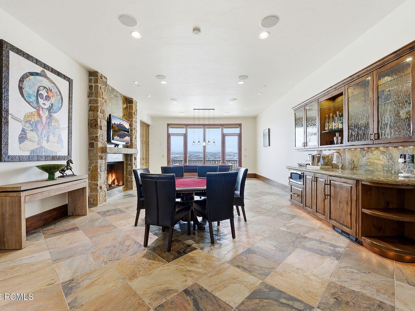 An enchanting dining area features a round table surrounded by sleek black leather chairs, creating a welcoming space for family gatherings. A striking piece of art adorns the wall, introducing vibrant colors and character. The natural stone fireplace adds warmth, while large windows frame breathtaking views, enhancing the room’s inviting ambiance. The earthy tones of the stone floor complement the harmonious color scheme, merging rustic charm with modern luxury. A stylish bar area, complete with glass-front cabinets, offers functionality for entertaining. Thoughtful lighting fixtures elevate the elegance, making this space perfect for both casual dining and special occasions.