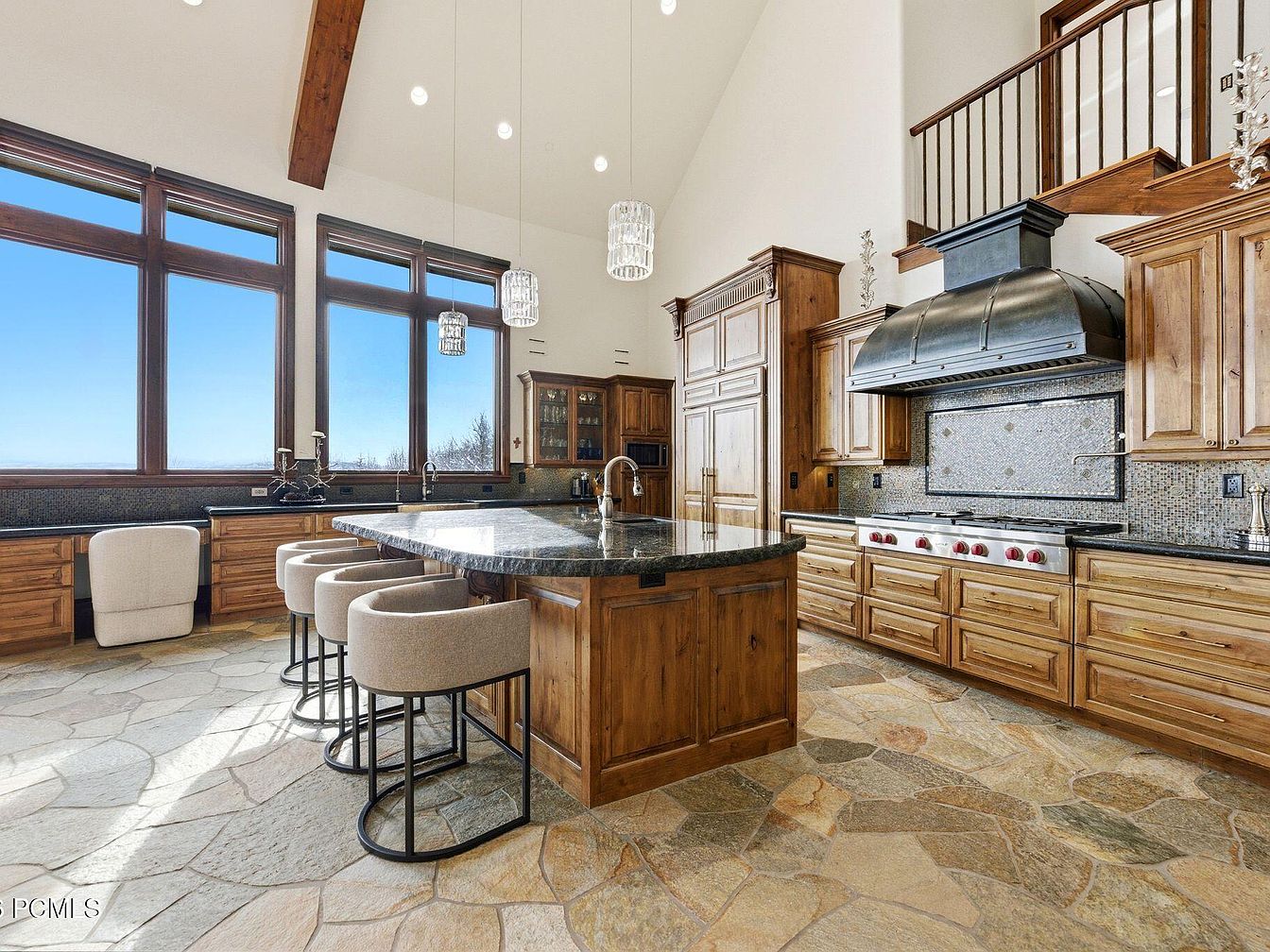 This spacious modern kitchen showcases a stunning blend of natural materials and contemporary elegance. The dark granite countertop contrasts beautifully with the warm wooden cabinetry, offering ample storage and functionality. Large windows allow for an abundance of natural light, enhancing the inviting atmosphere and providing breathtaking views. The stylish bar stools invite family gatherings, while the uniform stone flooring adds a rustic yet refined touch. A sleek, industrial-style hood over the stove and stylish pendant lighting above the island highlight the kitchen’s design, making it both a practical cooking space and a focal point for social interactions.
