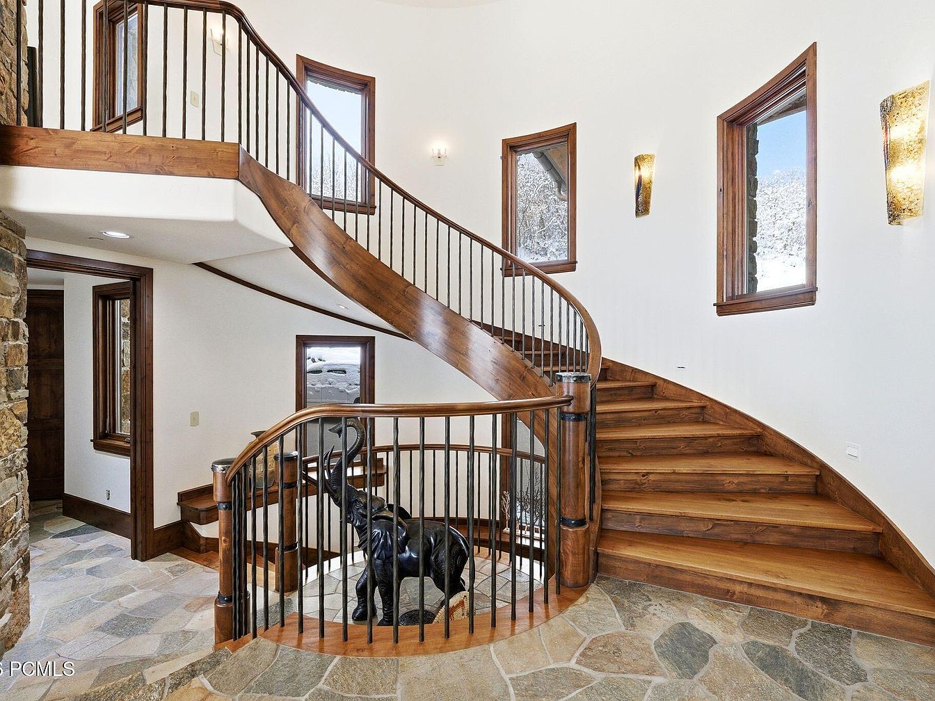 This entrance foyer showcases an impressive curved staircase, featuring rich wooden railings that add warmth to the space. The natural stone flooring complements the traditional architectural details, creating a rustic yet elegant atmosphere. Brightened by large windows, the area is flooded with natural light, highlighting the craftsmanship of the woodwork around the windows. A striking black elephant sculpture adds a unique focal point, inviting curiosity. The neutral color palette of the walls allows the stunning staircase and decorative elements to stand out, while thoughtful lighting fixtures enhance the inviting ambiance, making it a perfect family-friendly entryway.