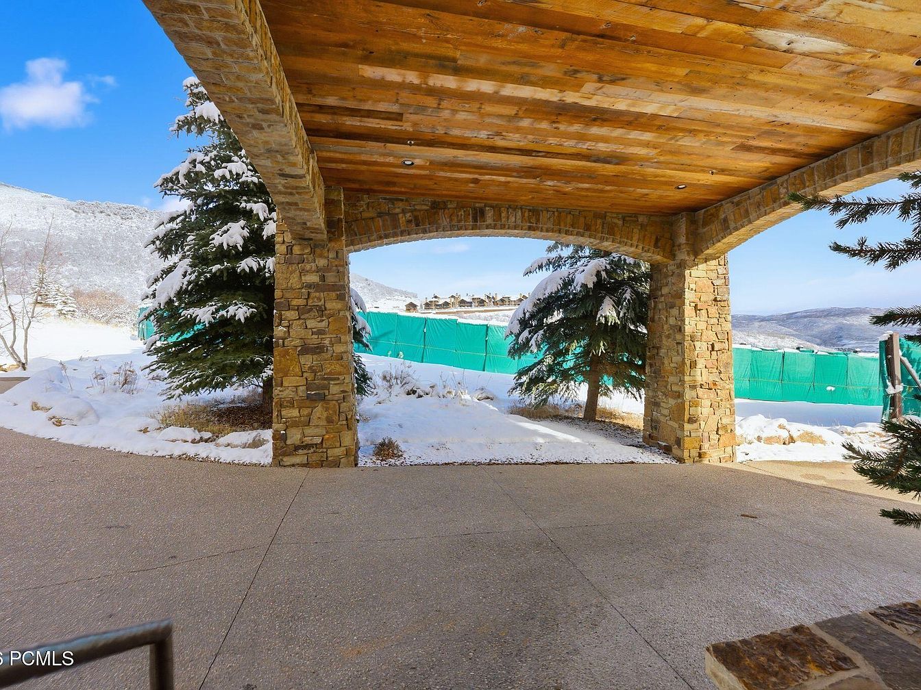 This inviting outdoor patio features stunning stone columns supporting a rustic wooden ceiling, creating a warm, welcoming atmosphere. The wide, concrete flooring is perfect for gatherings, seamlessly blending indoor and outdoor living. Lush pine trees dusted with snow frame the view, enhancing the serene mountain backdrop. The color palette of natural wood and stone harmonizes with the snowy landscape, making it a perfect year-round relaxation spot. Spacious enough for family activities, this outdoor area encourages quality time and enjoyment of nature, combining functionality and aesthetic charm in a tranquil setting.