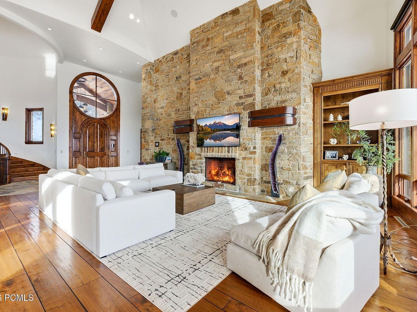 This inviting living room features a stunning stone fireplace, serving as the room’s focal point, surrounded by natural wood accents enhancing its warmth. The spacious layout is perfect for family gatherings, accentuated by plush white sofas adorned with soft throw pillows. A light-colored area rug sits atop rich wooden flooring, adding texture and comfort. Large windows allow abundant natural light, highlighting the elegant architectural details, including vaulted ceilings with exposed beams. A stylish wooden coffee table complements the modern decor, while built-in shelves provide both functionality and a place for decorative elements, creating a harmonious and cozy atmosphere.