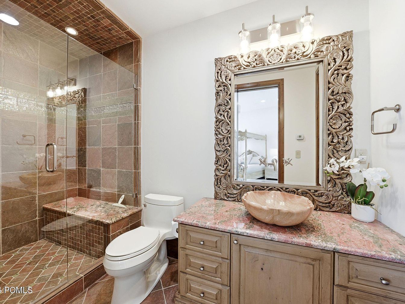 This luxurious bathroom combines elegance and functionality, featuring a spacious walk-in shower enclosed by glass panels, showcasing beautifully laid stone tiles in earthy tones. The rich hues enhance the tranquil ambiance, complemented by subtle lighting fixtures that illuminate the intricately designed vanity area. A stunning large-framed mirror adds depth, reflecting the natural light that filters in. The granite countertop, with its unique pink veins, contrasts beautifully against the warm wood cabinetry. Decorative elements, such as a bowl sink and fresh orchids, infuse the space with a touch of nature, making this bathroom a perfect family-friendly retreat.