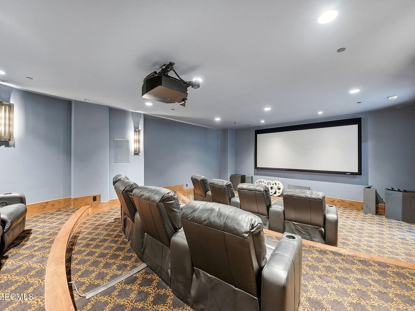 This luxurious home theater features a carefully curated layout designed for maximum comfort and entertainment. Plush recliners are arranged on tiered flooring, ensuring unobstructed views of the expansive screen. The soothing blue walls and ambient lighting create an intimate atmosphere perfect for movie nights. Accent wall sconces add elegance and warmth, while the intricate patterned carpet enhances the aesthetic experience. The built-in surround sound system ensures an immersive auditory experience, making this space ideal for family gatherings or film marathons. Thoughtfully designed for both relaxation and entertainment, this home theater embodies modern sophistication.