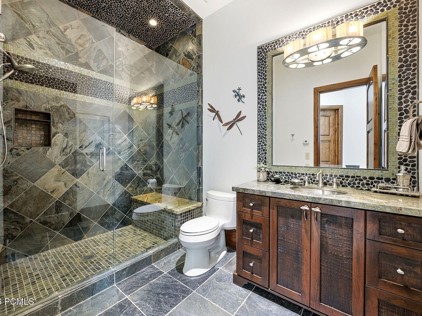 This elegant bathroom features a sleek, modern design with an impressive glass-enclosed shower, showcasing a striking combination of slate tiles arranged in a diamond pattern. The earthy tones of grey and dark hues create a sophisticated atmosphere, enhanced by the chic pebble-accented backsplash framing the large mirror. Natural wood cabinetry adds warmth, offering ample storage while complementing the granite countertop’s polished surface. Thoughtfully positioned lighting fixtures illuminate the space, providing both functionality and style. Family-friendly elements, such as the easy-to-clean surfaces and spacious layout, ensure comfort and convenience for everyday use.