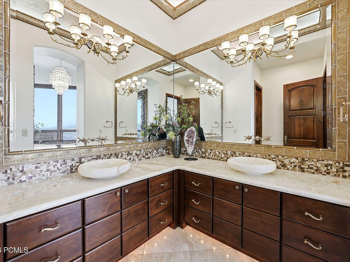 This luxurious bathroom exudes elegance and tranquility, featuring a spacious dual vanities design. The rich wooden cabinetry contrasts beautifully with the sleek marble countertops, enhancing the overall opulence. A striking mosaic backsplash integrates shades of white, cream, and soft purple, adding texture and visual interest. Above, a stunning chandelier casts ambient lighting that complements the warm tones of the decor. Large windows invite natural light, while offering picturesque views of the outdoors. Thoughtful details, like ample storage and stylish fixtures, make this the perfect family-friendly oasis, blending functionality with a spa-like retreat for relaxation.