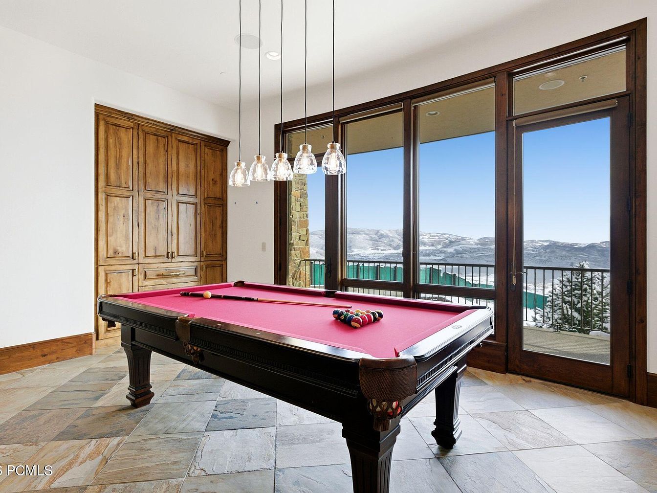 This inviting game room features a stunning pool table at its center, complete with a vibrant pink felt surface that adds a splash of color to the neutral palette. Natural light floods in through expansive floor-to-ceiling windows, offering breathtaking mountain views that enhance the tranquility of the space. Rich wooden cabinetry complements the rustic charm, providing ample storage while maintaining an open feel. Slate tile flooring both grounds the room and adds a touch of sophistication. Pendant lighting over the table creates a warm ambiance, making this area perfect for family game nights or entertaining friends.