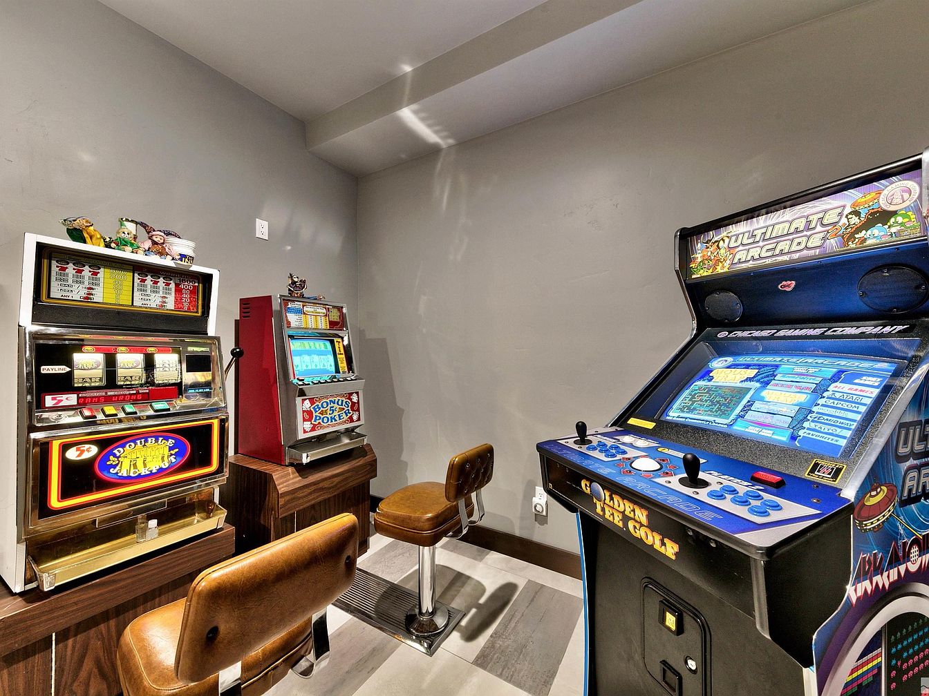 This inviting game room is a playful sanctuary ideal for family fun. Featuring classic slot machines and an arcade cabinet, the space exudes nostalgia and excitement. The layout encourages social interaction, with stylish, adjustable barstools paired with a sleek wood counter, perfect for enjoying refreshments during game sessions. The walls are painted in a soft gray, creating a soothing backdrop that highlights the vibrant colors of the gaming machines. Modern lighting adds a cozy yet energetic ambiance, making it an ideal gathering spot for both adults and children. This room seamlessly blends leisure and entertainment, fostering quality family time.