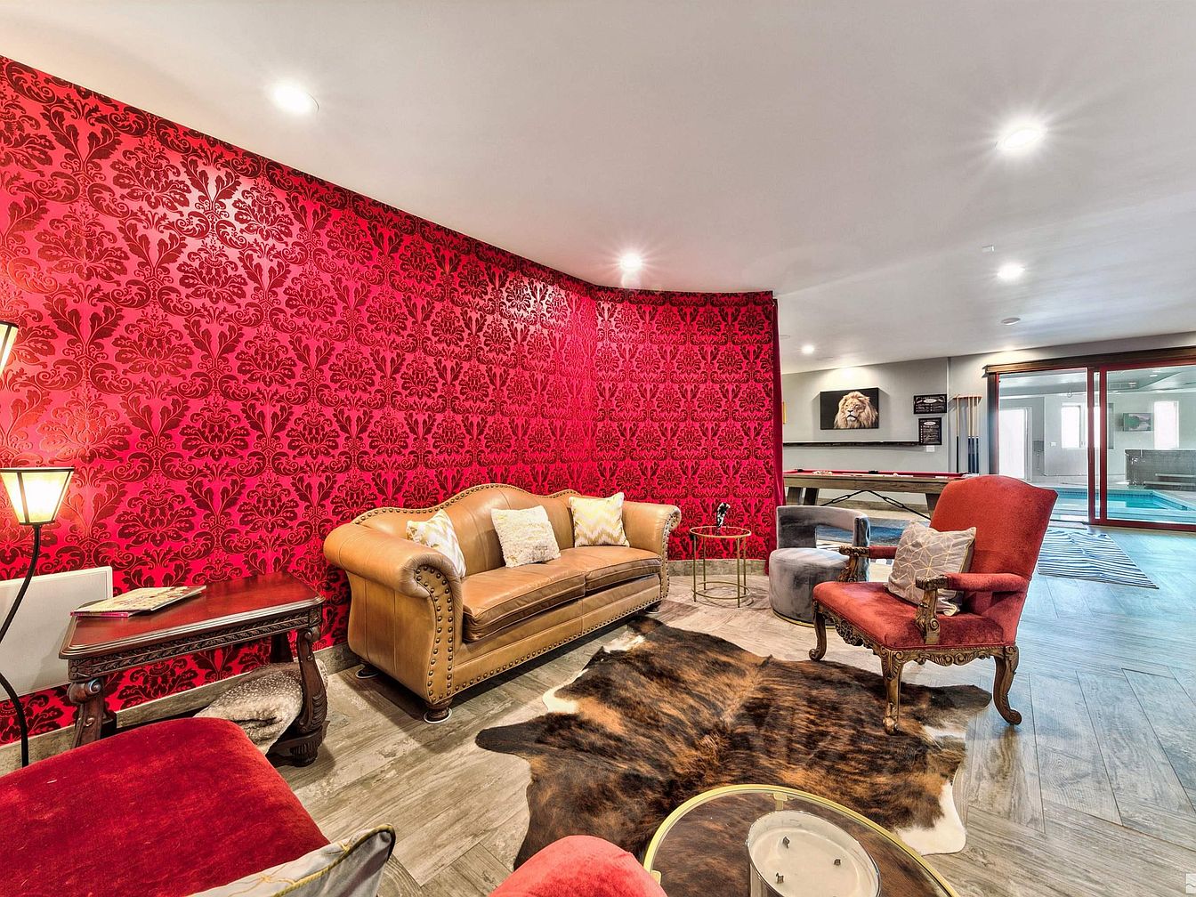 This vibrant living room features an eye-catching red damask accent wall that sets a bold tone for the space. The layout allows for comfortable family gatherings, highlighted by a plush leather sofa adorned with decorative pillows. A vintage-style armchair complements the decor, while a stylish side table provides practical surface space. The use of mixed materials, including a chic cowhide rug and light hardwood flooring, adds texture and warmth. Natural light pours in from large sliding doors, enhancing the inviting atmosphere. This room beautifully marries contemporary flair with classic charm, making it perfect for entertaining and relaxation.