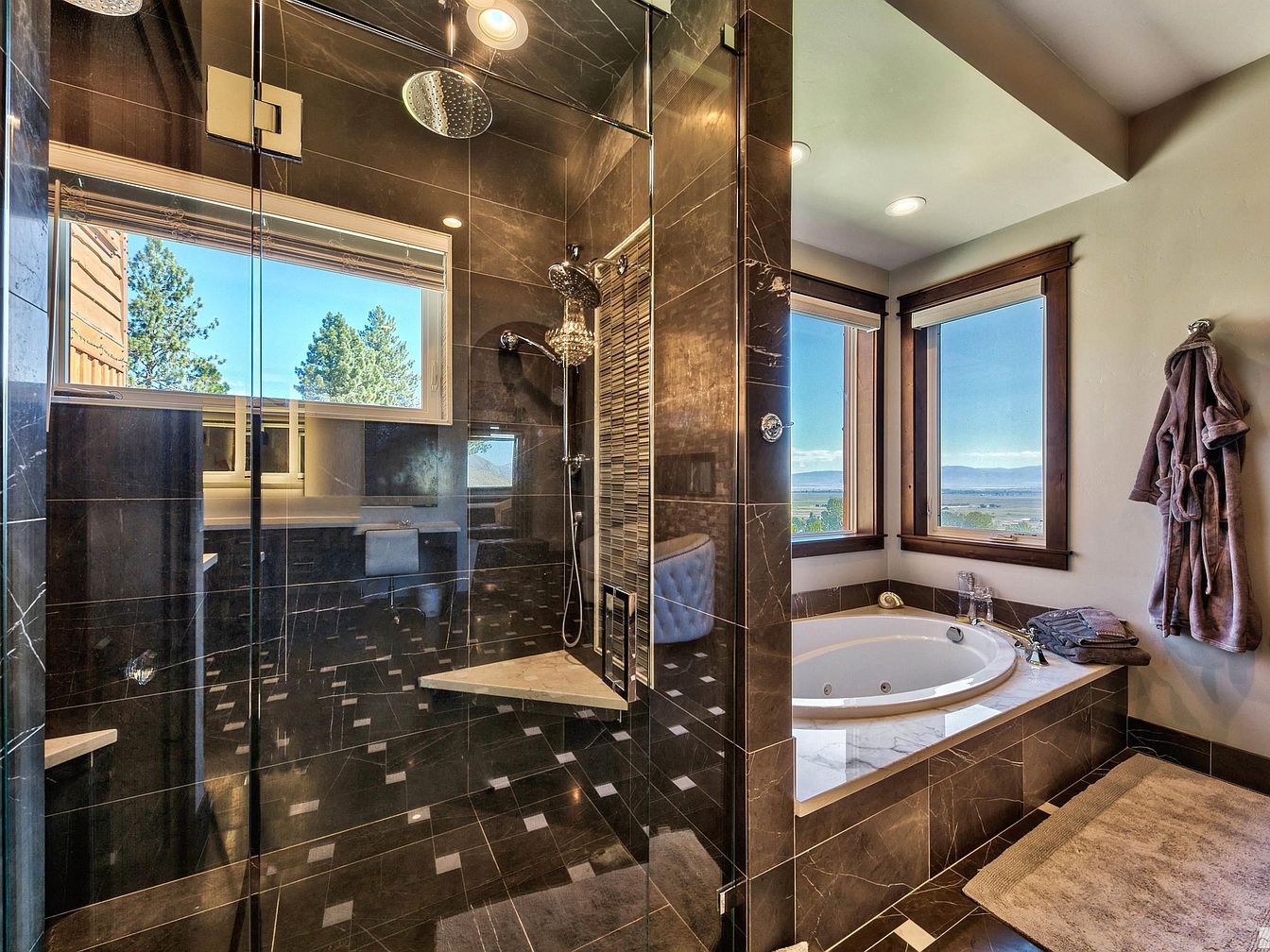 This elegant master bathroom features a modern design with sleek black marble tiles that create a striking contrast against the warm wooden accents. The spacious walk-in shower, equipped with dual rainfall showerheads, offers a spa-like experience, complemented by a large window that floods the area with natural light while framing stunning views. A luxurious jetted tub invites relaxation, situated next to the stylish vanity with ample storage. Soft, neutral tones harmonize with rich browns, enhancing the tranquil ambiance. Thoughtful details, such as plush towels and contemporary fixtures, make this sanctuary both inviting and functional for family living.