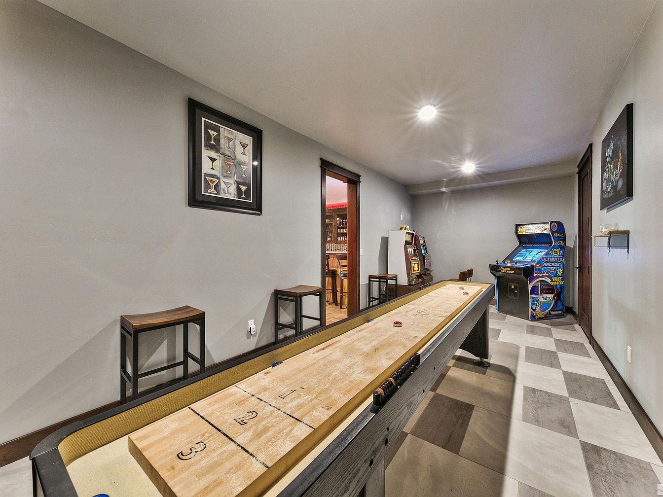 This spacious game room combines fun and relaxation, featuring a sleek shuffleboard table as the center of attention. The neutral gray walls provide a modern backdrop for the playful decor, highlighted by stylish wall art. Seating is versatile with sturdy, minimalist bar stools that promote a casual atmosphere. The flooring alternates between light and dark tiles, enhancing the visual interest. In one corner, classic arcade games add a nostalgic touch, inviting family and friends to engage in friendly competition. Warm lighting illuminates the space, ensuring it remains inviting for gatherings, making it a perfect retreat for leisure activities.