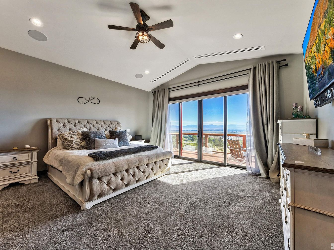 This luxurious master bedroom features a spacious layout with a stunning view through expansive sliding glass doors, leading to a private balcony. The color palette blends soft grays and neutral tones, enhancing the calming atmosphere. A tufted upholstered bed serves as the room’s centerpiece, adorned with an array of decorative pillows for added comfort. Rich, plush carpeting offers warmth underfoot, while elegant curtains frame the view, creating a serene retreat. Architectural details, such as the high ceilings and modern ceiling fan, add charm and functionality, making it a perfect family-friendly space for relaxation and rejuvenation.