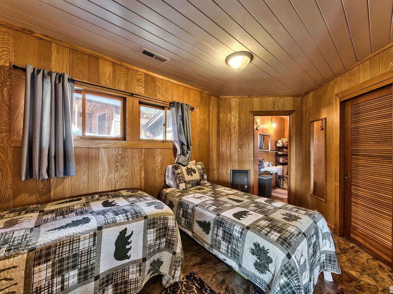 This charming kid’s bedroom features two cozy twin beds, each dressed in delightful bear-patterned quilts. The rich wood paneling creates a warm, inviting atmosphere, while the soft grey curtains gently frame the windows, allowing ample natural light to brighten the space. Thoughtfully designed for comfort and functionality, the room includes a stylish wooden closet and an adjoining nook that offers easy access to additional storage. The earthy color palette harmonizes with the outdoor-inspired decor, adding a touch of rustic charm. With its ample space for play and relaxation, this bedroom is perfect for a growing family.