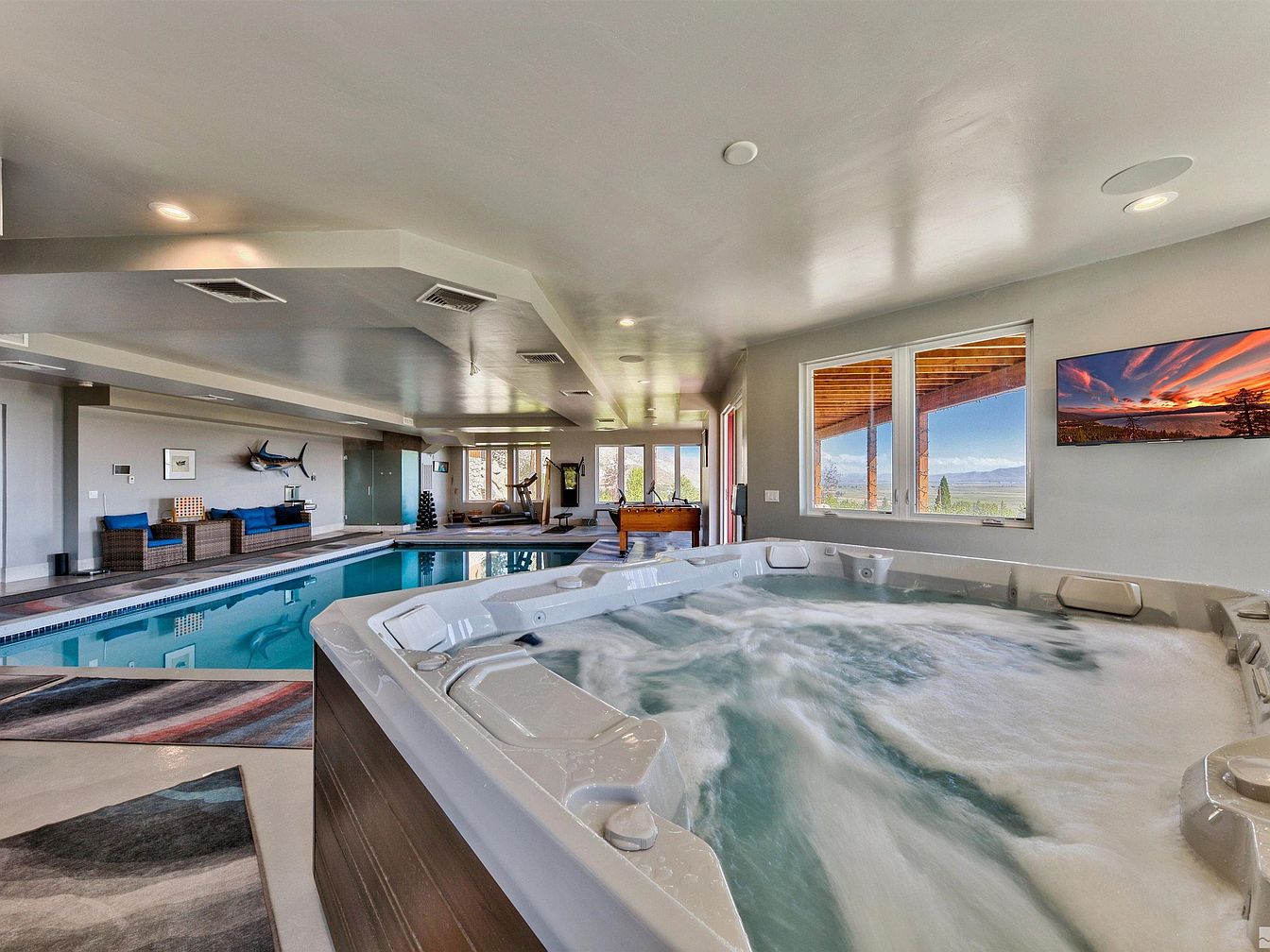 This luxurious indoor pool area seamlessly blends relaxation and entertainment, featuring a heated pool beside a bubbling hot tub. The contemporary layout is enhanced by large windows that frame stunning outdoor views, filling the space with natural light. The calming color scheme includes soft whites and blues, while plush seating arranged around the pool creates a welcoming atmosphere. Architectural detailing such as recessed lighting and sleek lines adds to the modern aesthetic. Family-friendly elements like a dedicated exercise area and easy access to the outdoors make this space perfect for leisure and gatherings.
