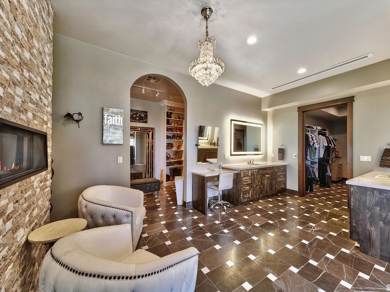 A beautifully designed dressing room featuring a chic blend of elegance and functionality. The sleek, stone accent wall with a modern fireplace provides a cozy touch, while the polished dark tile floor, adorned with white insets, reflects light, enhancing the spacious feel. Plush, tufted armchairs invite relaxation, creating an inviting nook. A stylish vanity area adorned with a backlit mirror offers ample lighting and practicality. Rich wooden cabinetry and an organized closet layout ensure easy access to wardrobe essentials. The serene color palette of soft grays harmonizes beautifully with the sophisticated details, making this space ideal for style enthusiasts.
