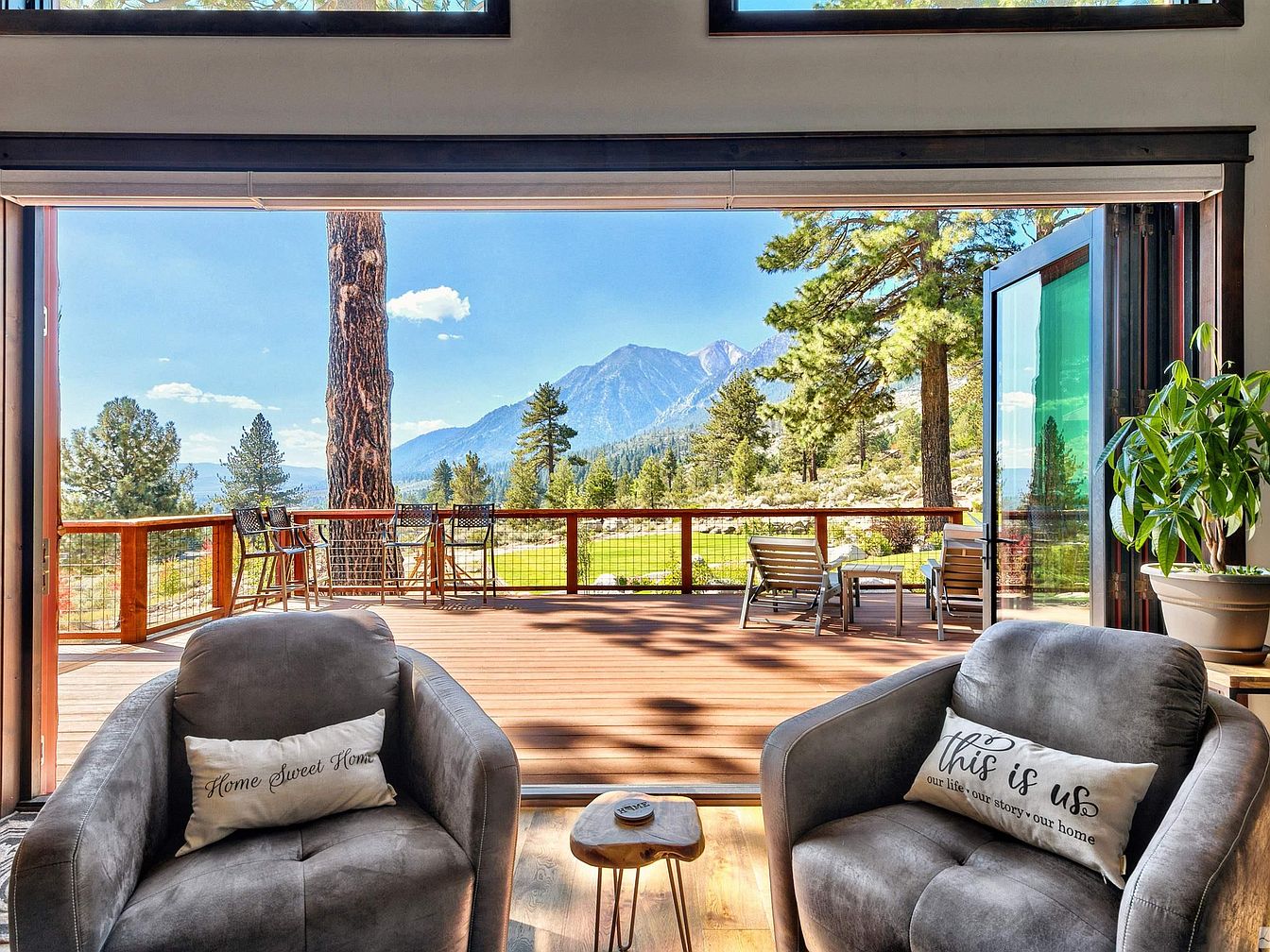 This inviting living room features large sliding doors that seamlessly connect the indoors to the breathtaking outdoor deck offering stunning mountain views. Two plush, gray chairs adorned with heartfelt throw pillows—”Home Sweet Home” and “This Is Us”—create a warm, family-friendly atmosphere. The natural light floods the space, highlighting the minimalist design elements that emphasize comfort and tranquility. Wooden beams and accents harmonize with the sleek modern architecture, while a small side table adds functionality. Lush greenery from a potted plant enhances the aesthetic, bringing a touch of nature inside and making this space perfect for relaxation and gathering.