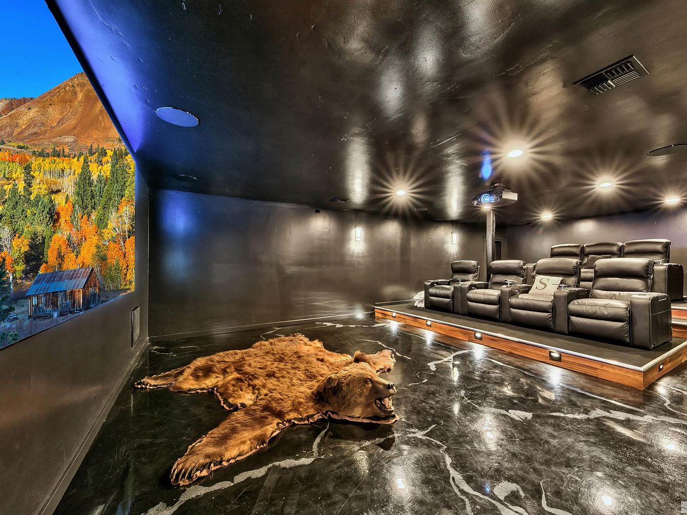 This luxurious home theater is the epitome of comfort and style, featuring plush black leather recliners arranged on a raised platform for optimal viewing. The sleek, black walls and glossy floor create a modern, cinematic atmosphere, enhanced by ambient lighting that highlights the space. Adding a rustic touch, a bear skin rug lies elegantly on the floor, complementing the nature-inspired artwork visible on the adjacent wall, showcasing vibrant fall foliage. This room is ideal for family movie nights or entertaining guests, blending contemporary design with warm, welcoming elements, ensuring an immersive viewing experience.