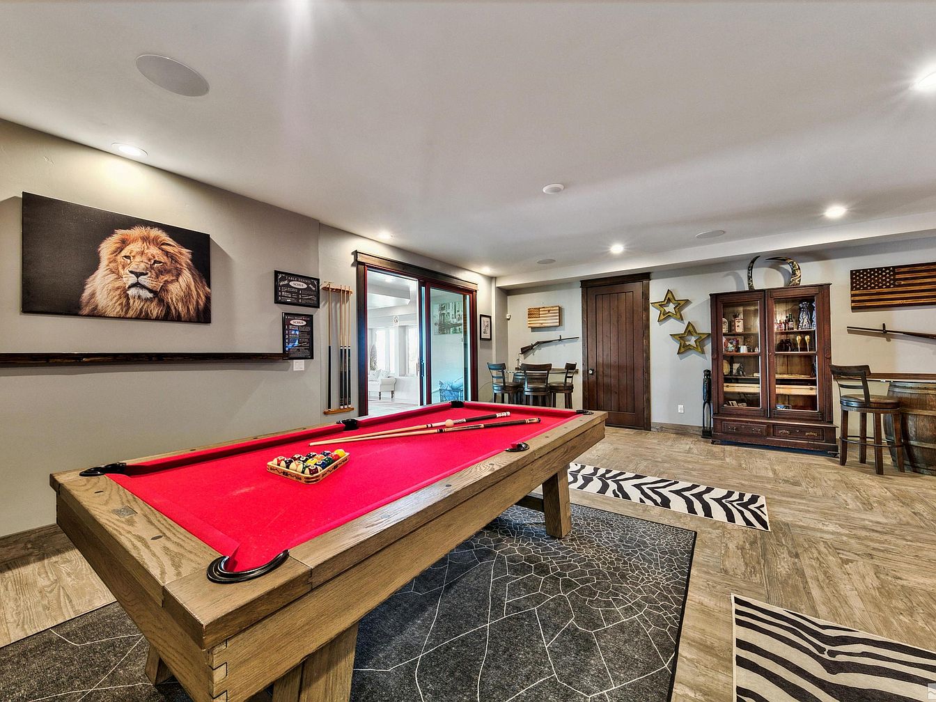 This inviting game room is designed for family entertainment and relaxation. A striking red pool table takes center stage, surrounded by rustic wooden elements that bring warmth to the space. The walls are adorned with unique decor, including a captivating lion portrait and Americana touches, adding character. The stylish bar area is perfect for casual gatherings, featuring high backed stools for comfortable seating. Soft lighting and neutral tones create a cozy ambiance, while playful zebra print rugs add a touch of whimsy. With ample space for games and conversation, this room fosters joyful moments and memorable gatherings.