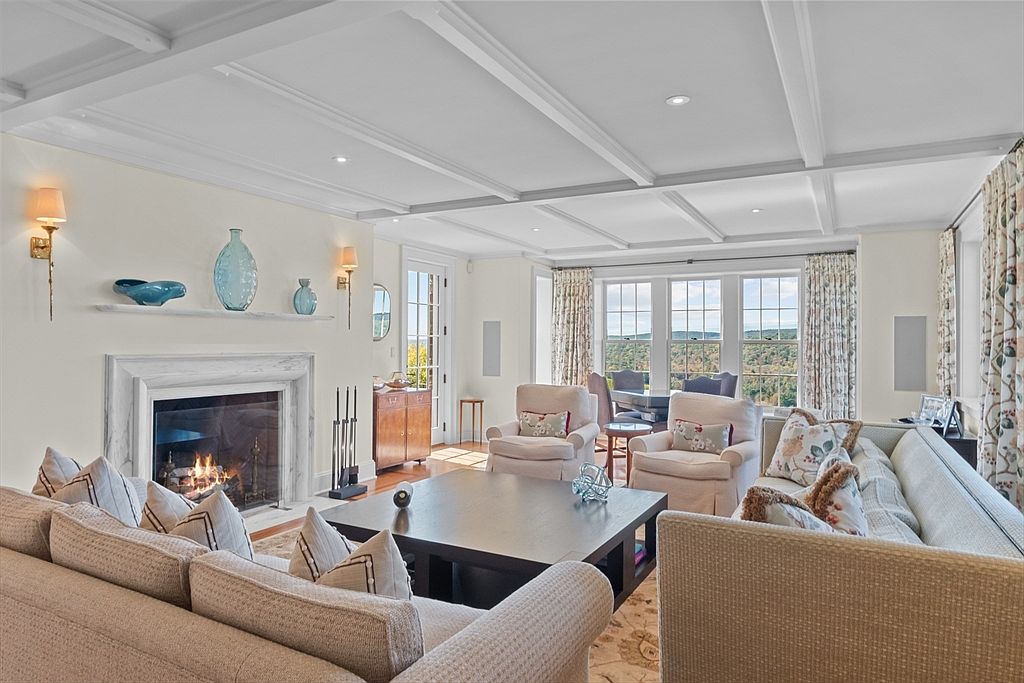 This inviting living room features a spacious layout, accentuated by large windows that provide breathtaking views of the surrounding landscape. A plush beige sectional sofa and complementary armchairs, adorned with floral prints, create a cozy gathering spot. The room’s soft, neutral color scheme harmonizes with subtle pops of blue from carefully placed decorative vases. Architectural elements, such as the coffered ceiling and elegant fireplace framed in marble, enhance the room’s charm. Family-friendly features include durable furnishings and an open flow to the dining area, encouraging both relaxation and entertaining in a warm, welcoming atmosphere.