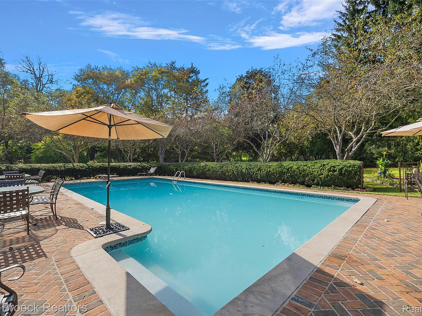 This outdoor space is a perfect haven for relaxation and entertainment, featuring a pristine swimming pool surrounded by a charming patio. The pool is elegantly framed by a combination of smooth stone and classic brickwork, adding a timeless look. Cozy seating arrangements, complete with comfortable chairs and tables, invite leisurely afternoons by the water. Large umbrellas provide shade, enhancing the usability of the space during sunny days. Lush greenery and manicured hedges surround the area, creating a tranquil atmosphere that is ideal for family gatherings or peaceful solitude. This backyard truly embodies the essence of outdoor living.