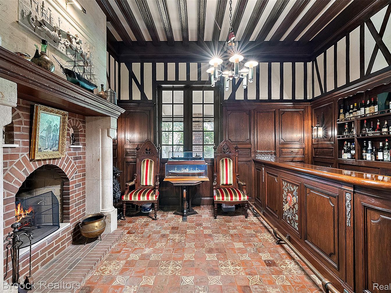 Rich wood paneling and intricate ceiling beams define this inviting home bar area, evoking a timeless elegance. The cozy brick fireplace adds a warm touch, perfect for gatherings. A striking bar countertop, adorned with detailed carvings, invites guests to enjoy beverages while seated in plush, striped chairs. Large, multi-pane windows allow natural light to flood the space, enhancing the vibrant color palette of earthy tones and deep reds. Decorative elements, such as the classic artwork and vintage decor, create an atmosphere of sophistication, making it an ideal retreat for family and friends to unwind and socialize.