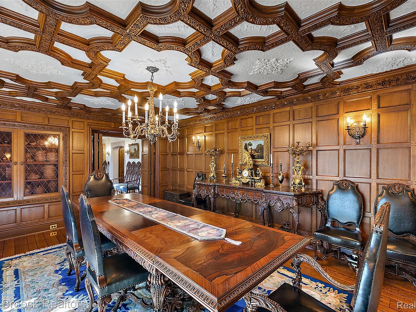 This elegant dining room exudes timeless charm with its rich wooden paneling and intricately coffered ceiling. The centerpiece is a grand, polished dining table surrounded by ornate, high-backed chairs, inviting memorable family gatherings. The warm brown tones of the wood complement the subtle blues of an area rug, providing a cozy yet sophisticated ambiance. Tasteful decor, including antique candleholders and a striking wall art piece, enhances the room’s character. Light fixtures with a classic design illuminate the space, creating a warm glow perfect for both intimate dinners and festive celebrations, making it a true centerpiece of the home.