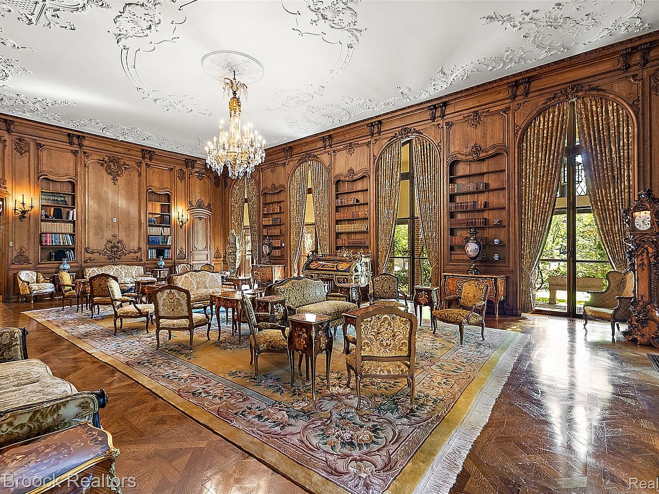 This sophisticated living room is defined by its rich wooden paneling and intricate molding that adorns the ceilings. The layout features an inviting arrangement of ornate seating, with high-backed chairs and plush sofas upholstered in luxurious fabrics, promoting comfort and conversation. A large, vintage chandelier hangs gracefully, casting warm light over the elegantly patterned area rug that anchors the space. Tall windows, framed by exquisite drapes, invite natural light and showcase the lush garden outside, merging indoor and outdoor beauty. Bookshelves line the walls, creating an inviting atmosphere perfect for family gatherings and relaxation.