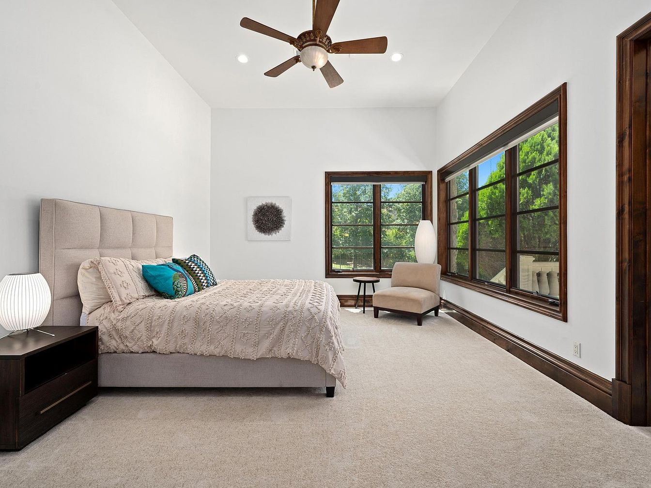 This spacious master bedroom features an inviting layout with plush neutral carpeting and a soft beige upholstered bed as the centerpiece. Large, richly framed windows flood the room with natural light and offer scenic views of the outdoors, while a cozy accent chair in the corner creates a perfect reading nook for relaxation. Warm wood trim and a modern ceiling fan add architectural interest. The decor balances comfort and elegance, with subtle patterned bedding and pops of color from decorative pillows. Minimalistic furniture and clean lines enhance the family-friendly, calming atmosphere, ideal for unwinding or spending quiet moments together.